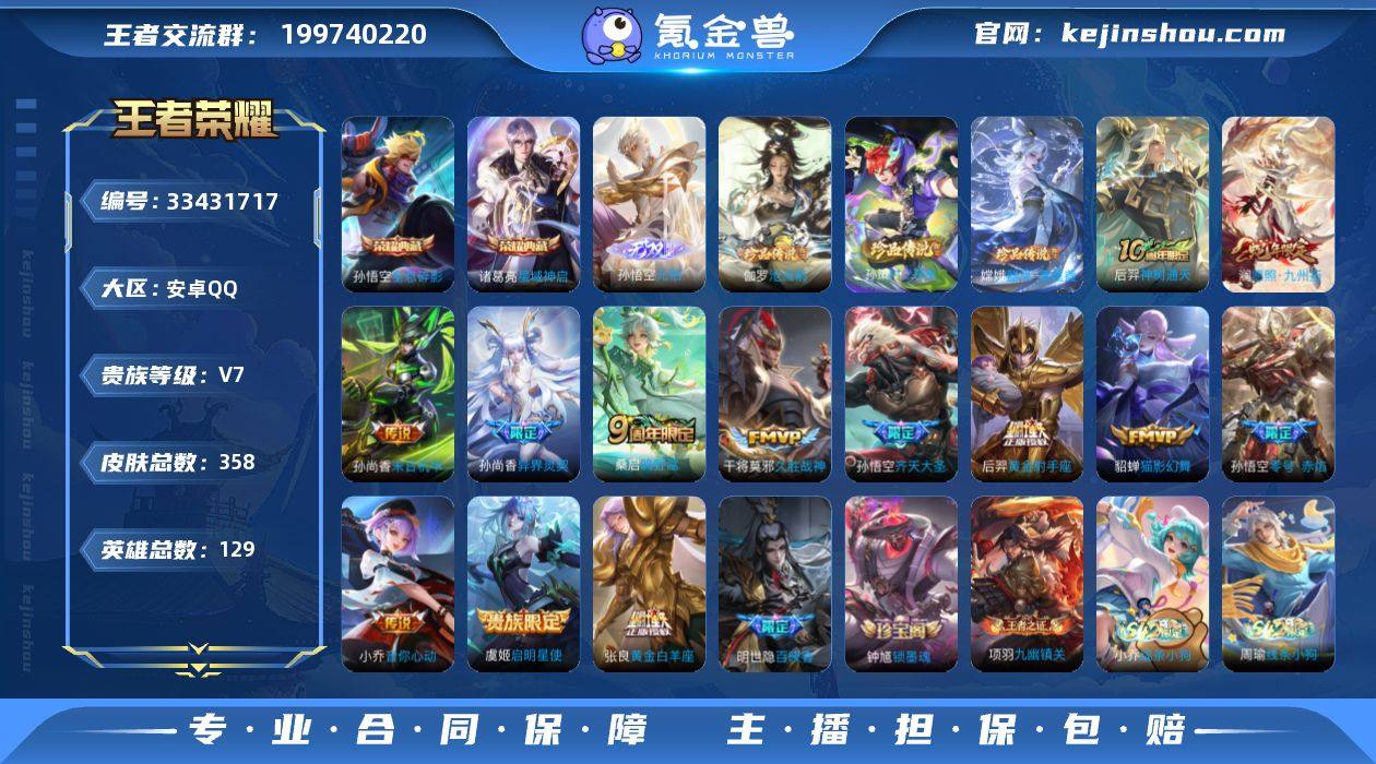 安卓Q-V7-至尊星耀IV段位-129英雄-358皮肤-2典藏皮肤-1无双-3珍品传说-13传说-104史诗 【英雄全皮】:孙权全皮,敖隐全皮,蒙恬全皮,空空儿全皮,影全皮 【荣耀典藏】:孙悟空全息碎影,诸葛亮星域神启 【无双皮肤】:孙悟空无相 【珍品传说】:伽罗沧流箭,嫦娥器灵落星盏,孙策时之奇旅 【传说皮肤】:后羿神树通天,澜愿照九州拓,桑启鸣野蒿,孙悟空齐天大圣,孙尚香异界灵契,小乔音你心动,虞姬启明星使,孙悟空零号赤焰,貂蝉猫影幻舞,张良黄金白羊座,干将莫邪久胜战神,后羿黄金射手座,孙尚香末日机甲 【限定皮肤】:蔡文姬夏日便利店,大乔绒语心约,虞姬夏日便利店,姜子牙天穹之誓,狄仁杰阴阳师,赵云皇家上将,嬴政优雅恋人,孙尚香蔷薇恋人,孙尚香异界灵契,鲁班七号狮舞东方,鲁班七号乒乒小将,庄周高山流水,阿轲迷踪丽影,扁鹊奇幻香踪,元歌云间偶戏,元歌无心,马可波罗暗影游猎,狄仁杰魔术师,狄仁杰万华元夜,达摩星际陆战队,达摩沙漠行僧,项羽海滩派对,老夫子醍醐杖,程咬金演武夺筹,刘邦夺宝奇兵,韩信逐梦之影,兰陵王金庭之子,亚瑟潮玩骑士王,孙悟空至尊宝,孙悟空大圣娶亲,孙悟空零号赤焰,孙悟空孙行者,孙悟空齐天大圣,后羿如梦令...