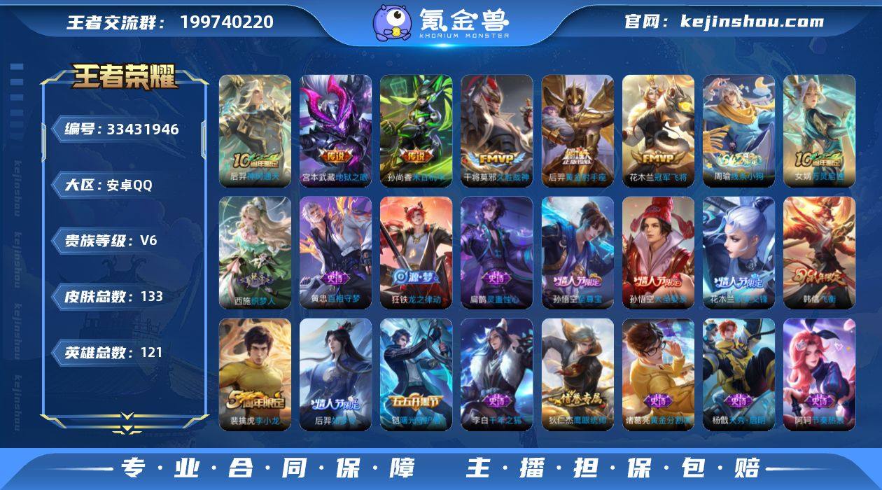 实名: 可修改 性别: 男号 贵族等级: V6 英雄数: 121 皮肤数: 133 传说皮: 黄金射手座,冠军飞将,久胜战神,末日机甲-孙尚香,地狱之眼,神树通天 限定皮: 李小龙,飞衡,至尊宝,如梦令-后羿,大圣娶亲,默契交锋-花木兰 亮点: 【优质装备】:黄金射手座,冠军飞将,久胜战神,末日机甲-孙尚香(绿蚂蚱),地狱之眼