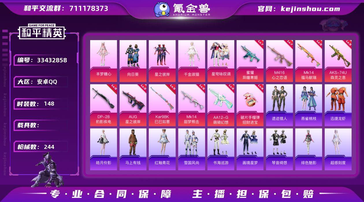 J3276 精品 5粉 10特 星之彼岸 羊梦糖心 千金淑猫 星穹咏叹调 小丑鱼 暗影哥特 满级心之恋语 安卓 手Q-5粉装-10特效枪-0载具-7粉色飞行器-70981热力值-11王牌印记-148套装-244枪皮 【热门品类】:套装-小丑鱼,套装-龟仙人,套装-暗影哥特,套装-粉红小猪 【粉色套装】:粉装-向日葵,粉装-星之彼岸,角色-千金淑猫,粉装-星穹咏叹调,角色-羊梦糖心 【粉色枪皮等级】:M416-心之恋语(七级),AUG-星之彼岸(五级),蜜獾-异瞳寒姬(七级),AKS-74U-森灵之息(五级),Kar98K-巳巳如意(五级),Mk14-甜梦熊击(五级),Mk14-福马献瑞(五级),AA12-G-萌骑幻想(四级),DP-28-豹影疾电(五级),破片手榴弹-招财进宝(四级) 【粉色枪皮】:M416-心之恋语,AUG-星之彼岸,蜜獾-异瞳寒姬,AKS-74U-森灵之息,Kar98K-巳巳如意,Mk14-甜梦熊击,Mk14-福马献瑞,AA12-G-萌骑幻想,DP-28-豹影疾电,破片手榴弹-招财进宝 【粉色飞行器】:绝对恒星飞行器,炫彩糖果飞行器,祥瑞起舞飞行器,星之彼岸飞行器,祥瑞锦鲤飞行器,繁龙极客飞行器,万象金身飞行器 【粉色降落伞】:绝对恒星降落伞,星之彼岸降落伞,洛神天依降落伞,圣堂之誓降落伞,花傲天降落伞,镜域双华降落伞,江南烟雨降落伞,电糖...