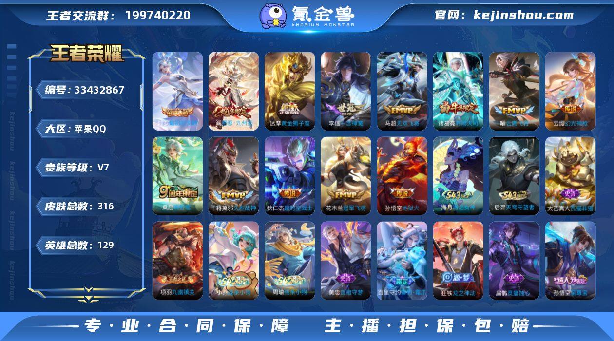 苹果Q-V7-永恒钻石II段位-129英雄-316皮肤-1典藏皮肤-12传说-85史诗 【英雄全皮】:孙权全皮,敖隐全皮 【荣耀典藏】:伽罗最初的交响 【传说皮肤】:澜愿照九州拓,云缨幻光神枪,桑启鸣野蒿,马超无双飞将,诸葛亮时雨天司,曜云鹰飞将,李信一念神魔,干将莫邪久胜战神,达摩黄金狮子座,花木兰冠军飞将,孙悟空地狱火,狄仁杰超时空战士 【限定皮肤】:姜子牙天穹之誓,狄仁杰阴阳师,赵云皇家上将,赵云百木心枪,墨子神迹守卫,嬴政优雅恋人,嬴政白昼王子,孙尚香蔷薇恋人,鲁班七号狮舞东方,庄周高山流水,高渐离死亡摇滚,吕布猎兽之王,元歌云间偶戏,元歌无心,夏侯惇朔风刀,甄姬游园惊梦,曹操烛龙,典韦穷奇,典韦蓝屏警告,狄仁杰魔术师,狄仁杰万华元夜,达摩沙漠行僧,项羽海滩派对,老夫子醍醐杖,老夫子航海奇遇记,关羽冰锋战神,程咬金演武夺筹,韩信逐梦之影,韩信飞衡,兰陵王金庭之子,亚瑟潮玩骑士王,孙悟空至尊宝,孙悟空大圣娶亲,孙悟空孙行者,牛魔御旌,后羿辉光之辰,后羿圣弓游侠,李元芳云中旅人,虞姬霸王别姬,钟馗神迹守卫,钟馗驱傩正仪,女娲朔望之晖,干将莫邪真爱魔法,蔡文姬繁星吟游,太乙真人饕餮,鬼谷子原初探秘者,鬼谷子五...