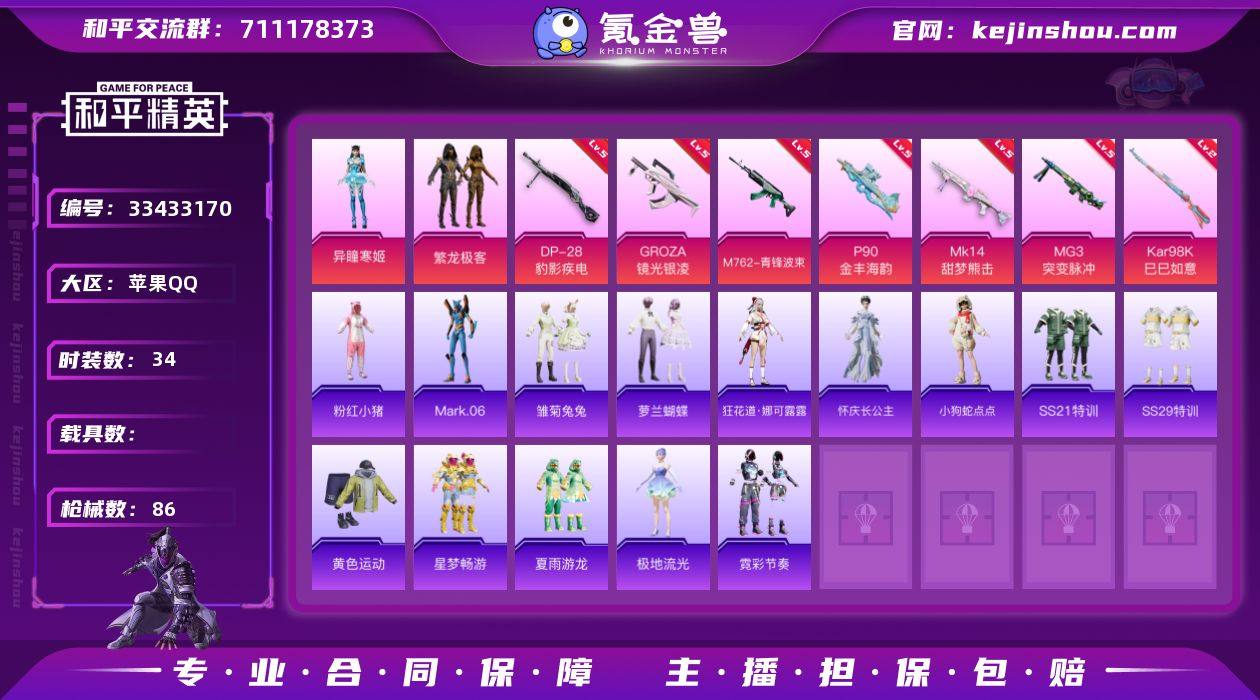 苹果 手Q-2粉装-8特效枪-0载具-3粉色飞行器-22957热力值-2王牌印记-34套装-86枪皮 【热门品类】:粉装-繁龙极客,套装-粉红小猪,角色-Mark.06 【粉色套装】:粉装-繁龙极客,角色-异瞳寒姬 【粉色枪皮等级】:GROZA-镜光银凌(五级),M762-青锋波束(五级),ACE32-萌骑漫游(五级),P90-金丰海韵(五级),Kar98K-巳巳如意(二级),Mk14-甜梦熊击(五级),DP-28-豹影疾电(五级),MG3-突变脉冲(五级) 【粉色枪皮】:GROZA-镜光银凌,M762-青锋波束,ACE32-萌骑漫游,P90-金丰海韵,Kar98K-巳巳如意,Mk14-甜梦熊击,DP-28-豹影疾电,MG3-突变脉冲 【粉色飞行器】:炫彩糖果飞行器,繁龙极客飞行器,深渊漩涡飞行器 【粉色降落伞】:绝对恒星降落伞,星梦奇缘降落伞,初号机 觉醒Ver.降落伞,金丰海韵降落伞,忍者神龟降落伞,宇宙意志降落伞,临安公主降落伞,星穹咏叹调降落伞,极意拳锋降落伞,炫彩糖果降落伞 【稀有套装】:套装-雪国风尚,套装-炫彩糖果,套装-雏菊兔兔,套装-萝兰蝴蝶,角色-狂花道·娜可露露,角色-怀庆长公主,玩偶服-小狗蛇点点 【稀有枪皮】:AUG-冰晶雪宝,SCAR-L-炫彩节奏,SCAR-L-玉兔迎春,AUG-耀粉歌者,M762-天降萌叽,UZI-啾咪啾咪,UZI-天降萌叽,UM...
