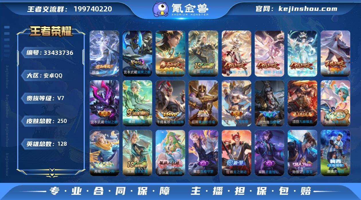 安卓Q-V7-永恒钻石III段位-128英雄-250皮肤-1珍品传说-11传说-57史诗 【英雄全皮】:孙权全皮,敖隐全皮,影全皮 【珍品传说】:嫦娥器灵落星盏 【传说皮肤】:狄仁杰神骥赴朔漠,后羿神树通天,妲己愿照众生和,澜愿照九州拓,虞姬愿照岁时盈,桑启鸣野蒿,李元芳飞鸢探春,干将莫邪久胜战神,后羿黄金射手座,李白凤求凰,宫本武藏地狱之眼 【限定皮肤】:白起狰,蒙犽顽岩魄,姜子牙天穹之誓,杨戬破阵退雄兵,狄仁杰阴阳师,虞姬凯尔特女王,赵云皇家上将,赵云引擎之心,嬴政白昼王子,孙尚香蔷薇恋人,芈月重明,吕布猎兽之王,元歌无心,夏侯惇朔风刀,曹操烛龙,典韦穷奇,典韦蓝屏警告,狄仁杰魔术师,项羽海滩派对,项羽霸王别姬,关羽冰锋战神,程咬金演武夺筹,孙悟空至尊宝,牛魔御旌,钟馗驱傩正仪,杨玉环遇见飞天,女娲朔望之晖,太乙真人饕餮,百里玄策原初追逐者,弈星混沌棋,明世隐疑决卦,裴擒虎天狼狩猎者,狂铁御狮,米莱狄御霄,盾山御銮,上官婉儿梁祝,桑启海盐诗旅,裴擒虎梅西,鬼谷子天穹祈灯,沈梦溪龙舞盛年,刘邦剑破天穹,程咬金群星魔术团,刘备异域游侠,周瑜熔金海岸 【年限皮肤】:李白凤求凰,妲己愿照众生和,澜愿照九州拓,虞姬愿照...