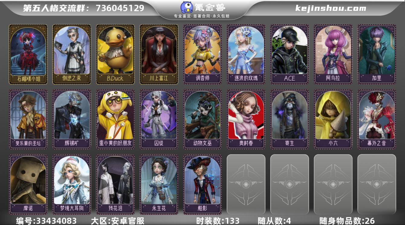 联动金皮「川上富江 B.Duck联动全套:B.Duck小黄鸭联动金皮+B.Duck系列紫皮/随从 石榴碟小姐、倒逆之汞、片刻闲暇、未至之人等限定金 - 时装:133件(6金+25+紫+其余蓝绿皮) - 随身物品:26件(1金+9紫+其余蓝绿挂) - 随从:4个(全联动稀有随从) 账号状态:无封禁、无找回、无绑定纠纷,可正常登录,支持平台全程验号 1个限定金挂+9个紫挂,4个联动随从