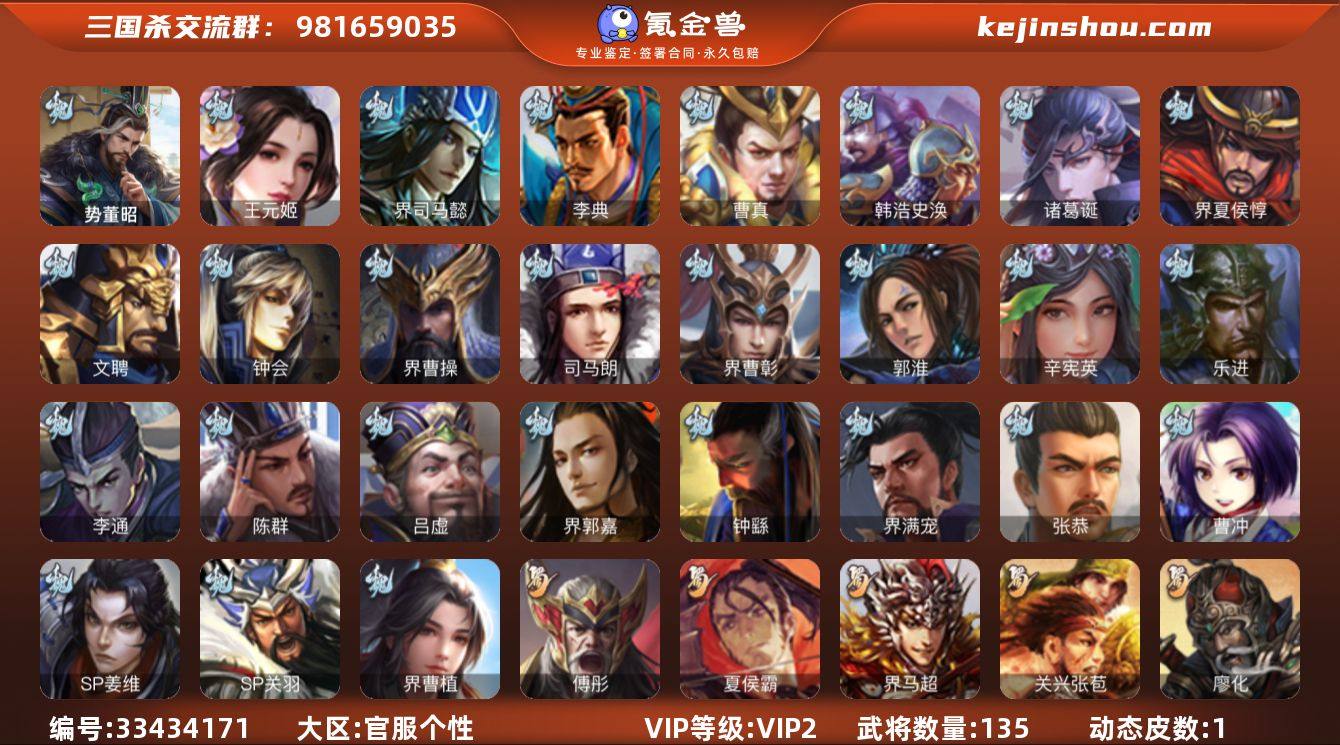 【JYSGS160】官阶:先锋及以下 VIP等级:VIP2级 史诗武将数:3 动态皮肤数:1 武将总数:135 史诗宝珠数:0 元宝数:334 将魂数:3771 /势董昭/王元姬/界徐盛/界曹操/界司马懿/界夏侯惇/界郭嘉/钟会/曹冲/郭淮/曹真/韩浩史涣/陈群/钟繇/界曹植/界曹彰/界满宠/辛宪英/诸葛诞/SP关羽/SP姜维/文聘/乐进/司马朗/李通/李典/吕虔/张恭/华雄/袁术/荀谌/界华佗/界袁术/公孙瓒/伏皇后/李儒/公孙渊/曹节/张宝/张鲁/张济/胡车儿/王濬/严颜/界刘备/界赵云/界马超/关兴张苞/廖化/关平/刘封/吴懿/周仓/张松/界关兴张苞/界马岱/夏侯霸/SP孙尚香/糜竺/SP徐庶/马忠/傅肜/谋小乔/孙邵/桥公/界黄盖/界周瑜/界大乔/界陆逊/界孙权/潘璋马忠/虞翻/朱然/孙鲁班/朱桓/顾雍/孙休/界朱治/诸葛瑾/孙鲁育/诸葛恪/大乔小乔/王元姬-婆娑起舞(动态)