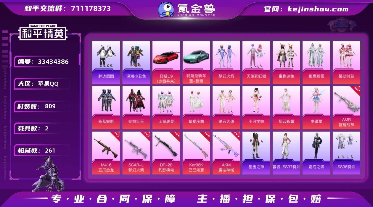 HY 公主号 实名: 不可修改 时装数: 809 载具数: 2 枪械数: 261 战备数: 195 热门装扮: 梦幻火箭(新101),深海小丑鱼,天使彩虹糖,梦魇先生,万圣娃娃,迅捷狂鲨,爱崽白熊,苍蓝魅影,炙焰红王,童趣迷兔,山涧鹿灵,相思残雪,馨动时刻,激萌罗小黑,胖达圆圆,兔兔白日梦,挚爱序曲,第五大道,小可学妹,烟云彩露,电磁星 载具: 特斯拉Roadster(水滴蓝),仰望U9(赤霞丹朱) 稀有枪皮: M416五爪金龙,SCAR-L梦幻火箭,AKM魔法神域,Kar98K-巳巳如意,AMR-智耀战神,DP-28-豹影疾电