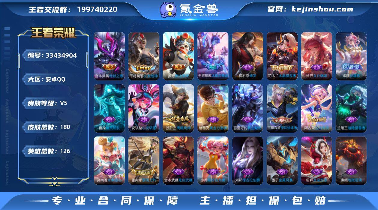 V5 4传说 126英雄 180皮肤 可修改实名 女号 【英雄全皮】孙权全皮,大禹全皮 【稀有英雄】大司命,韩信(韩跳跳),夏洛特(夏师傅),艾琳,橘右京(橘子),娜可露露(鸟人),不知火舞,赵云,金蝉(唐僧),戈娅 【传说皮】神树通天,地狱之眼,久胜战神,胖达荣荣 【珍宝阁皮】蔷薇恋人,女武神 【赛季/战令皮】古海寻踪(s33),海盐诗旅(s30),擒涛扼浪(s31),探海日志(s32),顽趣-梦奇,天穹祈灯(s34),朔风刀(s17),混沌棋(s18),疑决卦(s19),醍醐杖(s20),原初探秘者(s21),万华元夜(s22),演武夺筹(s23),驱傩正仪(s24),千军破阵(s25),圣弓游侠,真爱魔法,沙漠行僧(s26),金庭之子(s27),大漠名商(s28),云中旅人(s29) 【史诗皮】织梦人,线条小狗-周瑜,万灵启世,黄金分割率,特工魅影,江河有灵,末日机甲-吕布,乱世虎臣,节奏热浪,修罗,女仆咖啡,摇滚巨星,水果甜心,天才门将,心灵骇客,德古拉伯爵,暗隐猎兽者,幽灵船长,鬼剑武藏,地狱岩魂,拒霜思,缤纷独角兽,水晶猎龙者,金属风暴,原初追逐者,圣诞恋歌,鹰眼统帅,魅力维加斯,黎明之约,无心 【限定皮】高山流水,五谷丰年,游园惊梦,李小龙,冰霜恋舞曲 【普通皮】星梦巡礼,劲辣红锅,功夫炙烤,街头霸王,荣光之誓,径山谋武,鹤鸣心笺,溯影追猎,罗小黑战记-哪吒,踏浪烽翎,...