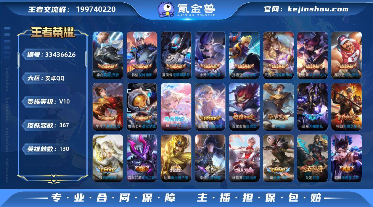 【王者荣耀】珍品无双0 典藏11 无双0 珍品传说1 传说24 史诗100 英雄130 皮肤367 贵族10级 荣耀典藏:无限飓风号|全息碎影|天鹅之梦|大秦宣太后|杀手不太冷|武则天|活力突击|鸣剑·曳影|倪克斯神谕|弑枪猎影|星空梦想__珍品传说:大耳狗之梦__传说皮肤:炽阳神光|启明星使|胖达荣荣|地狱之眼|地狱火|海洋之心|仲夏夜之梦|黄金狮子座|狄仁杰-超时空战士|黄金射手座|黄金白羊座|一念神魔|云鹰飞将|冠军飞将|李逍遥|孙尚香-末日机甲|白虎志|零号·赤焰|天魔缭乱|武陵仙君|武圣|永曜之星|觅芳踪|长夜焕生__稀有限定:御风骁将|白晶晶|至尊宝|梅西|瑞麟志|青龙志|玄武志|朱雀志|大圣娶亲|一生所爱|纯白花嫁|蔷薇恋人|奇迹圣诞|青春决赛季|猪悟能|李小龙|梁祝|暗影游猎|白昼王子|冰锋战神|冰霜恋舞曲|大漠名商|高山流水|古海寻踪|海滩派对|海盐诗旅|航海奇遇记|胡桃异想国|皇家上将|辉光之辰|混沌棋|剑破天穹|江河有灵|金庭之子|凯尔特女王|狂想玩偶喵|蓝屏警告|黎明之约|炼金王|美猴王|魔术师|千军破阵|擒涛扼浪|穷奇|驱傩正仪|沙漠行僧|朔风刀|死亡摇滚|探海日志|饕餮|醍醐杖|天狼狩猎者|天狼运算者|天穹祈灯|万华元夜|无心|五谷丰年|纤云弄巧|演武夺筹|疑决卦|阴阳师|游园惊梦|遇见飞天...