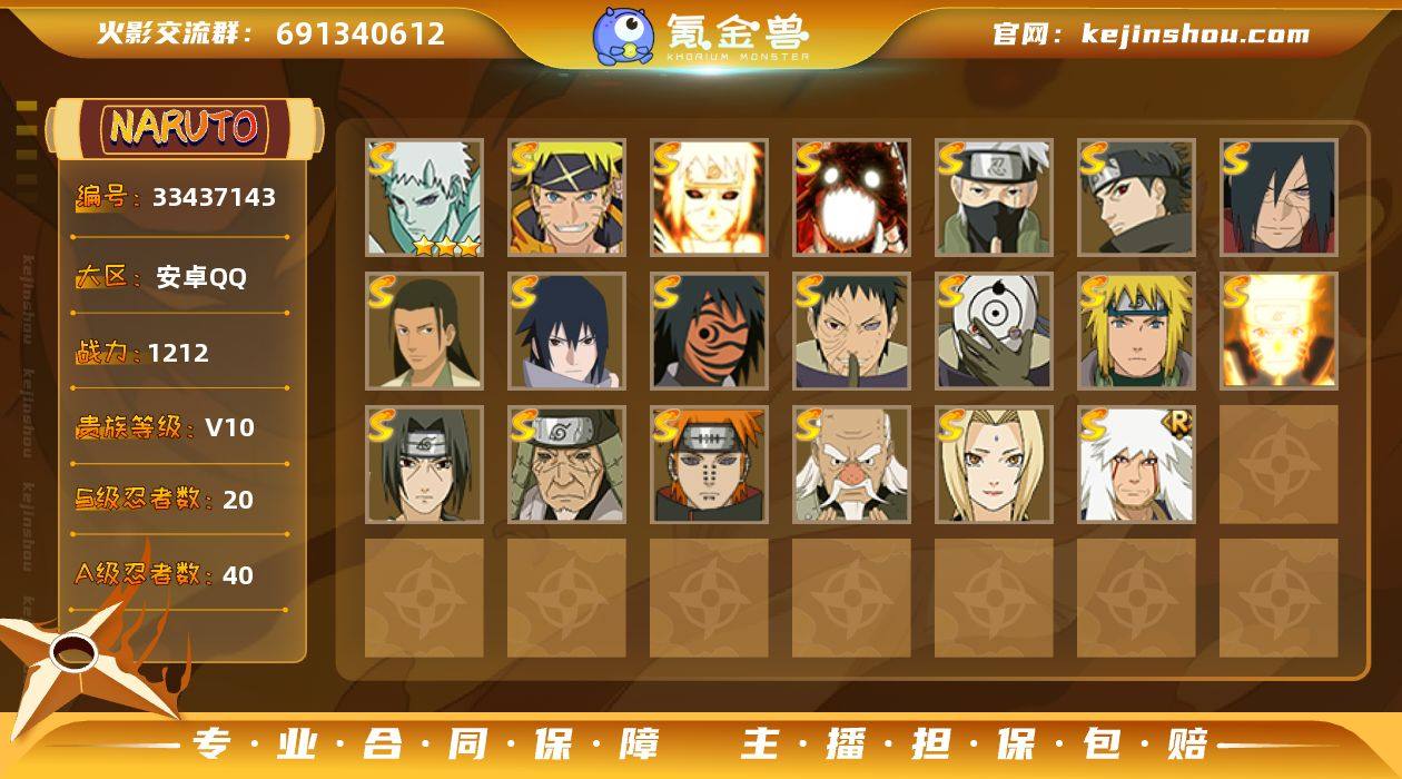 实名: 可修改 贵族等级: V10 S忍数: 20 A忍数: 40 战力值(万): 1212 S级忍者: 猿飞日斩「秽土转生」,佩恩「天道」,波风水门,纲手,宇智波鼬 「须佐能乎」,大野木 「忍界大战」,宇智波带土 「忍界大战」,自来也 「舞之豪杰」,宇智波斑「白面具」,漩涡鸣人 「九喇嘛连结」,神秘面具男 「红夜之刃」,宇智波佐助「永恒万花筒」,千手柱间·木叶创立,宇智波斑「秽土转生·解」,宇智波止水「须佐能乎」,旗木卡卡西「须佐能乎」,漩涡鸣人 「暴怒·第六尾」,波风水门「九喇嘛连结」,漩涡鸣人·宇智波佐助,宇智波带土「十尾人柱力」 亮点: 【优质装备】:猿飞日斩「秽土转生」,宇智波带土 「忍界大战」,宇智波斑「白面具」,漩涡鸣人 「九喇嘛连结」,神秘面具男 「红夜之刃」,宇智波佐助「永恒万花筒」,千手柱间·木叶创立,宇智波斑「秽土转生·解」,宇智波止水「须佐能乎」,旗木卡卡西「须佐能乎」,漩涡鸣人 「暴怒·第六尾」霸体lv11