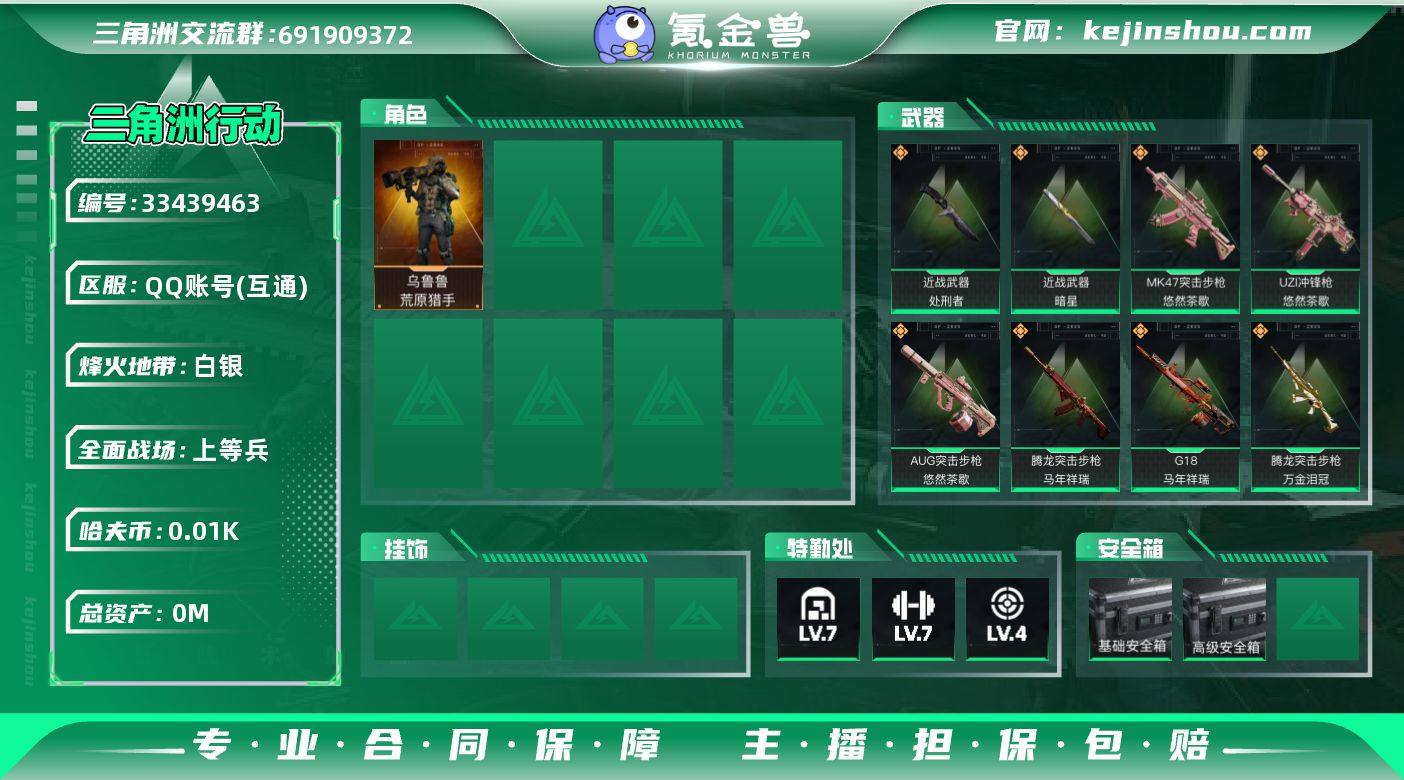 实名: 不可修改 烽火地带段位: 白银 全面战场段位: 上等兵 总资产: 85 哈夫币: 11 干员外观: 乌鲁鲁-荒原猎手 传说武器皮肤: 近战-暗星,MK47突击步枪-暗星,SR-3M紧凑突击步枪-暗星,近战-处刑者,M14射手步枪-蛮荒,腾龙突击步枪-马年祥瑞,G18-马年祥瑞,腾龙突击步枪-万金泪冠,AWM狙击步枪-万金泪冠,.357左轮-缄花,SR-25射手步枪-缄花,M14射手步枪-缄花,MK47突击步枪-悠然茶歇,AUG突击步枪-悠然茶歇,UZI冲锋枪-悠然茶歇