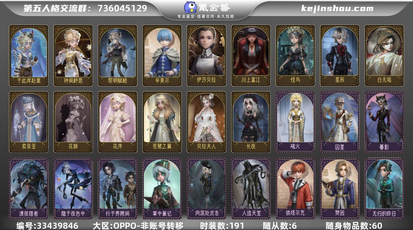 账号类型: 手机账号 时装数: 191 时装: 病患-星辰,红蝶-花嫁,红蝶-白无垢,黄衣之主-寄生之面,红夫人-贝拉夫人,红夫人-伊莎贝拉,画家-长生,画家-江户川乱步,祭司-神圣之辉,昆虫学者-索菲亚,昆虫学者-动植物学教授,冒险家-考古教授,盲女-吉尔达,梦之女巫-川上富江,入殓师-诺曼,入殓师-守钟人,调香师-笼中之蝶,调香师-花序,医生-雨中曲,园丁-怪鸟,心理学家-苍鹭之翼,心理学家-长夜,蜘蛛-墨卡托投影,红蝶-硫火,前锋-水球救生,舞女-流离的月光,记者-梦境中的爱丽丝,古董商-陶梦嫣,病患-休塔尔克,冒险家-赞因,“骑士”-辛美尔,“法罗女士”-向深处求告,小提琴家-人造天堂,囚徒-黎明赋格,画家-掌中篆记,舞女-钟阁杼思,幻灯师-于此岸赴宴,木偶师-行于界限间,喧嚣-隐于夜色中,噩梦-溃夜猎者,作曲家-暮影,逃脱大师-囚星,小说家-无归的昨日