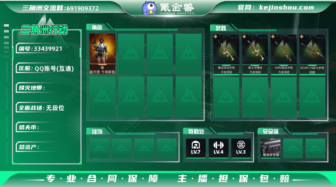 【总资产54M 哈弗币1547万 干员外观1个 烽火43级 黄金】仓库54M 现金1500万 蛊-能天使·午夜邮差 SCAR-H战斗步枪-启航,腾龙突击步枪-万金泪冠,Vector冲锋枪-能天使·午夜邮差,勇士冲锋枪-能天使·午夜邮差,勇士冲锋枪-万金泪冠,AWM狙击步枪-万金泪冠,复合弓-黑·天际线 挂凌工作白 df29-81,编号:WPJNW26