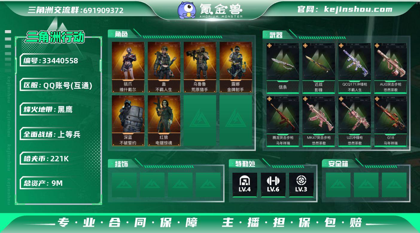 【特价满级男神号+6干员皮·维什戴尔+2近战刀皮·信条·影锋+6体·20传说枪皮】9m总资产-221k哈夫币-60烽火等级-黑鹰-13战场等级-上等兵 【干员外观】:骇爪-维什戴尔,深蓝-不破誓约,红狼-电锯惊魂,露娜-金牌射手,乌鲁鲁-荒原猎手,蛊-不羁人生 【近战皮肤】:近战-信条,近战-影锋,近战-黑鹰 【传说外观】:M4A1突击步枪-阿米娅,AUG突击步枪-悠然茶歇,SG552突击步枪-运动员,SCAR-H战斗步枪-启航,CAR-15突击步枪-阿米娅,腾龙突击步枪-马年祥瑞,KC17突击步枪-电锯惊魂,MK47突击步枪-悠然茶歇,P90冲锋枪-信条,UZI冲锋枪-悠然茶歇,QCQ171冲锋枪-不羁人生,M250通用机枪-骑士之心,M14射手步枪-蛮荒,M14射手步枪-缄花,SR-25射手步枪-信条,SR-25射手步枪-缄花,R93狙击步枪-维什戴尔,AWM狙击步枪-万金泪冠,.357左轮-缄花,G18-马年祥瑞 【史诗外观】:ASh-12战斗步枪-无极限,K416突击步枪-冬日风情,K416突击步枪-腊梅,K416突击步枪-阿萨拉特攻,AUG突击步枪-蝮蛇,M7战斗步枪-百步穿杨,SCAR-H战斗步枪-囚徒,G3战斗步枪-流沙送葬,G3战斗步枪-哈夫克警备,AS Val突击步枪-百步穿杨,K437突击步枪-守护者,K437突击步枪-丛影谍踪,MP5冲锋枪-战术竞备,MP5冲锋...