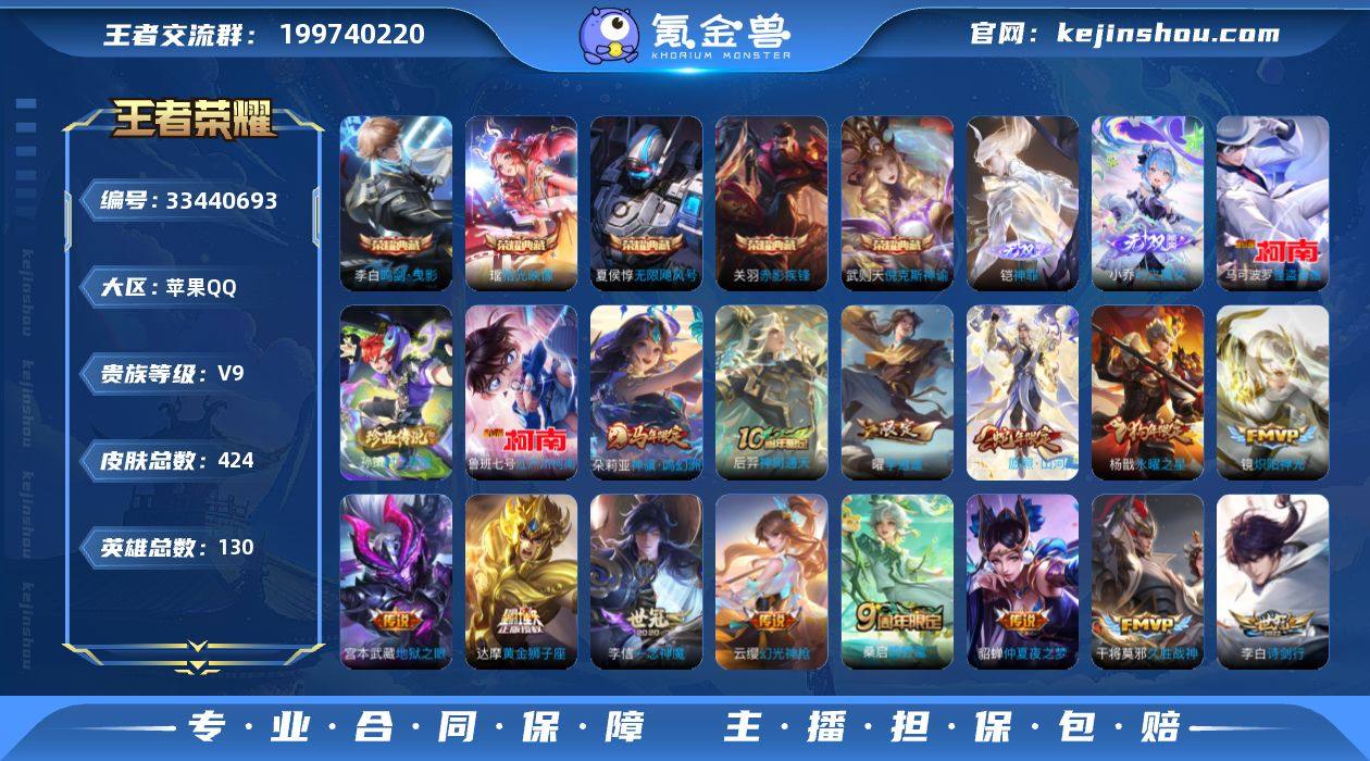 苹果Q-V9-永恒钻石II段位-130英雄-424皮肤-5典藏皮肤-1典藏英雄-2无双-3珍品传说-23传说-122史诗 【英雄全皮】:扁鹊全皮,孙权全皮,敖隐全皮,空空儿全皮 【荣耀典藏】:武则天英雄,武则天倪克斯神谕,夏侯惇无限飓风号,李白鸣剑曳影,关羽赤影疾锋,瑶拾光映像 【无双皮肤】:铠神罪,小乔时之魔女 【珍品传说】:孙策时之奇旅,鲁班七号江户川柯南,马可波罗怪盗基德 【传说皮肤】:朵莉亚神骥鸣幻洲,后羿神树通天,司空震愿照山河定,云缨幻光神枪,桑启鸣野蒿,庄周牧神诗旅,吕布怒海麟威,李白诗剑行,曜李逍遥 ,周瑜音你心动,铠绛天战甲,镜炽阳神光,虞姬启明星使,李信一念神魔,刘备时之恋人,貂蝉猫影幻舞,张良黄金白羊座,干将莫邪久胜战神,达摩黄金狮子座,后羿黄金射手座,杨戬永曜之星,貂蝉仲夏夜之梦,宫本武藏地狱之眼 【限定皮肤】:白起狰,虞姬夏日便利店,姜子牙天穹之誓,李白谪仙醉月,狄仁杰阴阳师,虞姬凯尔特女王,赵云皇家上将,赵云龙胆,墨子神迹守卫,墨子降魔,嬴政优雅恋人,嬴政白昼王子,孙尚香蔷薇恋人,鲁班七号狮舞东方,鲁班七号乒乒小将,庄周蜃楼王,庄周高山流水,高渐离死亡摇滚,孙膑妖精王,扁鹊炼金王,扁鹊奇幻香踪...
