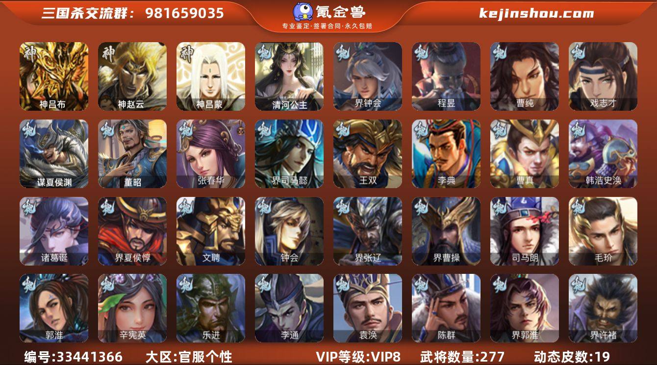 官阶:骠骑将军;VIP等级:VIP8;史诗武将数量:28;动态皮肤数量:19;武将总数:277;史诗宝珠数量:8;将魂数量:13374;神将:2;魏国史诗武将:12;蜀国史诗武将:7;吴国史诗武将:3;群史诗武将:12 神吕布,神赵云,界钟会,曹纯,戏志才,清河公主,程昱,谋赵云,谋马超,诸葛瞻,沙摩柯,谯周,界黄忠,花鬘,孙寒华,骆统,界徐盛,郑玄,杨彪,星黄忠,麹义,界左慈,杜预,谋张角,许攸,星董卓,兀突骨,司马昭,神吕蒙,SP关羽,乐进,曹昂,诸葛诞,朱灵,文聘,SP姜维,张春华,钟会,曹冲,郭淮,满宠,界王异,界曹操,界司马懿,界夏侯惇,界张辽,界许褚,界郭嘉,李典,曹真,韩浩史涣,陈群,曹叡,曹休,钟繇,司马朗,李通,辛宪英,吕虔,鲁芝,界荀彧,杜畿,张恭,界曹植,界满宠,界郭淮,卞夫人,蔡贞姬,袁涣,王双,崔琰,毛玠,谋于禁,牵招,谋夏侯渊,唐咨,董昭,势陈到,SP孙尚香,关银屏,夏侯霸,马良,关兴张苞,廖化,界马岱,关平,简雍,刘封,界法正,界关兴张苞,界刘备,界关羽,界赵云,界马超,SP徐庶,吴懿,周仓,张松,刘谌,糜竺,马忠,李严,界黄月英,界祝融,张翼,杨仪,邓芝,傅肜,界简雍,陈震,费祎,界周仓,宗预,谋庞统,谋张飞,霍峻,诸葛果,蒋琬费祎,甘夫人,凌操,大乔小乔,诸葛瑾,孙鲁育,程普,韩当,潘璋马忠,虞翻,朱然,界甘宁,界吕蒙,界黄盖...