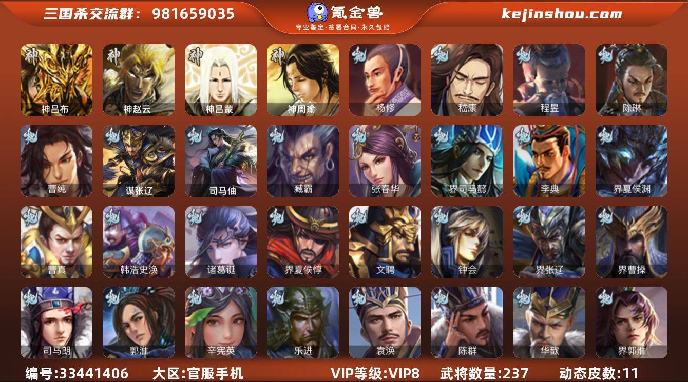 神吕布,神赵云,杨修,嵇康,陈琳,曹纯,程昱,谋赵云,谯周,界徐盛,贺齐,谋公孙瓒,麹义,沮授,卑弥呼,谋张角,友诸葛亮,星董卓,兀突骨,司马昭,神吕蒙,神周瑜,SP关羽,SP曹仁,乐进,曹昂,诸葛诞,朱灵,文聘,SP姜维,张春华,钟会,曹冲,郭淮,满宠,界王异,界曹操,界司马懿,界夏侯惇,界张辽,界许褚,李典,曹真,韩浩史涣,陈群,曹叡,钟繇,司马朗,辛宪英,吕虔,鲁芝,界曹植,界满宠,界郭淮,华歆,蔡贞姬,袁涣,崔琰,谋于禁,司马伷,谋张辽,界夏侯渊,臧霸,唐咨,SP孙尚香,关银屏,夏侯霸,马良,关兴张苞,廖化,界马岱,关平,刘封,界法正,界关兴张苞,界刘备,界关羽,界赵云,界马超,SP徐庶,吴懿,周仓,张松,夏侯氏,李严,界黄月英,张翼,杨仪,邓芝,傅肜,费祎,糜夫人,彭羕,谋庞统,谋黄月英,界张嶷,诸葛果,蒋琬费祎,甘夫人,凌操,诸葛瑾,孙鲁育,程普,韩当,潘璋马忠,虞翻,界甘宁,界吕蒙,界黄盖,界周瑜,界大乔,界陆逊,孙鲁班,朱桓,顾雍,孙休,全琮,阚泽,孙登,界孙权,界潘璋马忠,吕范,谋韩当,谋周瑜,界全琮,谋小乔,伏完,界袁术,SP赵...