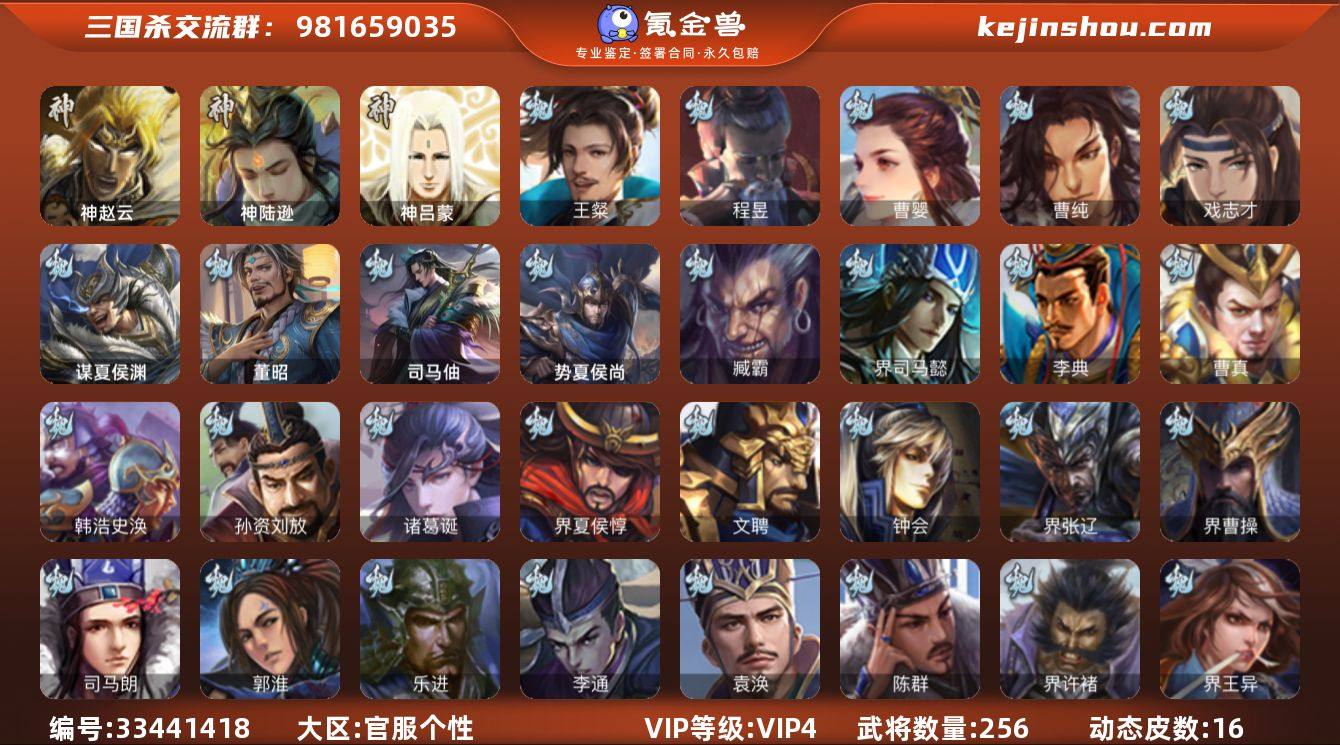 官阶:骠骑将军;VIP等级:VIP4;史诗武将数量:20;动态皮肤数量:16;武将总数:256;史诗宝珠数量:13;将魂数量:2444;神将:2;魏国史诗武将:6;蜀国史诗武将:5;吴国史诗武将:3;群史诗武将:4 神赵云,神陆逊,王粲,曹婴,曹纯,戏志才,程昱,谋马超,沙摩柯,谯周,界黄忠,花鬘,周处,界朱然,界徐盛,麹义,公孙康,星董卓,兀突骨,神吕蒙,势夏侯尚,SP关羽,SP蔡文姬,乐进,曹昂,诸葛诞,朱灵,文聘,SP姜维,钟会,曹冲,郭淮,满宠,界王异,界曹操,界司马懿,界夏侯惇,界张辽,界许褚,界郭嘉,李典,曹真,韩浩史涣,陈群,钟繇,司马朗,李通,孙资刘放,界荀彧,界曹丕,卞夫人,袁涣,崔琰,谋徐晃,谋于禁,司马伷,谋夏侯渊,臧霸,董昭,SP孙尚香,夏侯霸,马良,关兴张苞,廖化,界马岱,关平,简雍,刘封,界法正,界关兴张苞,界刘备,界关羽,界赵云,SP徐庶,吴懿,周仓,张松,刘谌,糜竺,马忠,李严,黄皓,界黄月英,界伊籍,界庞统,陈到,张翼,杨仪,界简雍,陈震,费祎,糜夫人,向宠,刘巴,界张嶷,谋张飞,吴班,霍峻,诸葛果,蒋琬费祎,糜芳傅士仁,甘夫人,凌操,大乔小乔,诸葛瑾,孙鲁育,程普,韩当,潘璋马忠,虞翻,朱然,界甘宁,界吕蒙,界黄盖,界周瑜,界大乔,界陆逊,孙鲁班,朱桓,顾雍,孙休,全琮,阚泽,孙登,界孙权,界张昭张纮,许贡,卫温诸葛直,界...