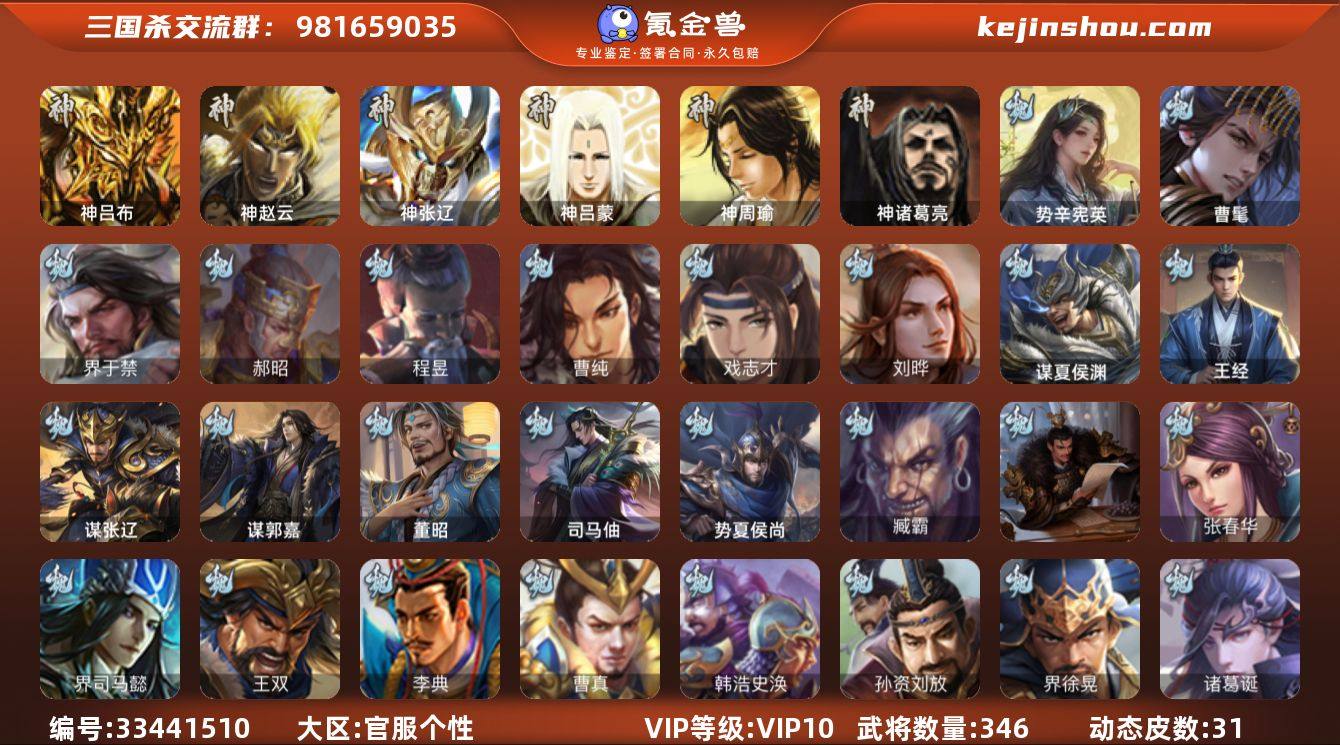 官阶:大将军;VIP等级:VIP10;史诗武将数量:37;动态皮肤数量:31;武将总数:346;史诗宝珠数量:0;将魂数量:2014;神将:4;魏国史诗武将:10;蜀国史诗武将:10;吴国史诗武将:7;群史诗武将:10 神吕布,神赵云,神张辽,神诸葛亮,曹髦,界于禁,郝昭,曹纯,戏志才,刘晔,势辛宪英,程昱,关索,谋诸葛亮,马云騄,谋赵云,谋马超,诸葛瞻,谯周,花鬘,谋关羽,势魏延,周处,骆统,留赞,界朱然,界徐盛,势陆郁生,势太史慈,左慈,张让,星黄忠,星甘宁,沮授,界李儒,星董卓,兀突骨,司马昭,神吕蒙,神周瑜,势夏侯尚,SP关羽,SP曹仁,SP蔡文姬,乐进,曹昂,诸葛诞,朱灵,文聘,SP姜维,张春华,钟会,曹冲,郭淮,满宠,界王异,界曹操,界司马懿,界夏侯惇,界张辽,界许褚,界郭嘉,李典,曹真,韩浩史涣,陈群,曹叡,钟繇,司马朗,李通,郭皇后,孙资刘放,辛宪英,界甄姬,吕虔,鲁芝,蒯越蒯良,界荀彧,界徐晃,界曹丕,界邓艾,界曹植,界满宠,界郭淮,华歆,蔡贞姬,王双,崔琰,曹嵩,谋于禁,谋荀彧,界曹休,王经,司马伷,谋张辽,谋郭嘉,谋夏侯渊,臧霸,唐咨,董昭,势陈到,SP孙尚香,关银屏,夏侯霸,马良,关兴张苞,廖化,界马岱,关平,简雍,刘封,界法正,界关兴张苞,界刘备,界关羽,界赵云,SP徐庶,吴懿,周仓,张松,刘谌,糜竺,李严,黄皓,界黄月英,界诸葛亮,...