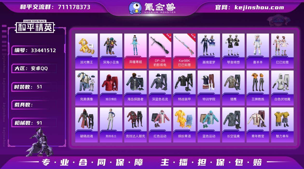 【kyhp1934】安卓 手Q-1粉装-4特效枪-0载具-1粉色飞行器-20115热力值-2王牌印记-51套装-91枪皮 【热门品类】:套装-派对舞王,套装-深海小丑鱼 【粉色套装】:角色-异瞳寒姬 【粉色枪皮等级】:Kar98K-巳巳如意(五级),Mk14-福马献瑞(五级),AA12-G-萌骑幻想(四级),DP-28-豹影疾电(五级) 【粉色枪皮】:Kar98K-巳巳如意,Mk14-福马献瑞,AA12-G-萌骑幻想,DP-28-豹影疾电 【粉色飞行器】:炫彩糖果飞行器 【粉色降落伞】:异瞳寒姬降落伞,极意拳锋降落伞,炫彩糖果降落伞,辉云木星降落伞 【稀有套装】:套装-巳巳如意,套装-雪国风尚,套装-炫彩糖果,套装-马上有钱,玩偶服-喜羊羊,套装-画境星梦,套装-琴音绮想,套装-雨过天青,套装-红釉青花,角色-幽雨猫猫 【稀有枪皮】:AUG-冰晶雪宝,AKM-破晓战魂,M16A4-红色方程式,M16A4-蓝色火焰,SCAR-L-夜灯,SCAR-L-红色方程式,M416-红色方程式,M416-蓝色火焰,AUG-耀粉歌者,G36C-星穹咏叹调,ACE32-画境星梦,UZI-红色方程式,UMP45-夜灯,UMP45-蓝色火焰,Vector-生命誓言,汤姆逊-耀粉歌者,MP5K-画境星梦,P90-巳巳如意,Kar98K-红色方程式,M24-影袭,Mini14-耀粉歌者,M417-虹云熊熊,M1加兰德-画境星梦,S686-红...