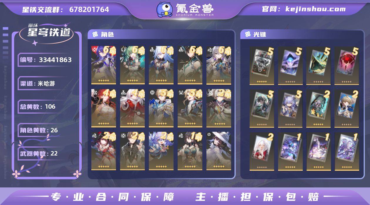 70级,女主,124黄,梦华72,星琼3611,星轨专票19,星轨通票9,26个五星角色:满命镜流,满命黄泉,满命藿藿,满命布洛妮娅,满命丹恒饮月,4命克拉拉,4命姬子,3命彦卿,3命杰帕德,2命流萤,2命白露,2命花火,2命瓦尔特,1命阮梅,长夜月,遐蝶,缇宝,风堇,大丽花,符玄,真理医生,丹恒腾荒,托帕账账,Archer,罗刹,卡芙卡,22个五星光锥:精5行于流逝的岸,精5记忆的质料,精5星海巡航,精5记一位星神的陨落,精3比阳光更明亮的,精3时节不居,精2无可取代的东西,精2惊魂夜,精2制胜的瞬间,精1梦应归于何处,精1此身为剑,精1纯粹思维的洗礼,精1如泥酣眠,精1游戏尘寰,精1镜中故我,精1但战斗还未结束,精1勿忘她的火焰,精1记忆永不落幕,精1致长夜的星光,精1让告别更美一些,精1不息的演算,精1孤独的疗愈 黄泉6+5 300爆伤