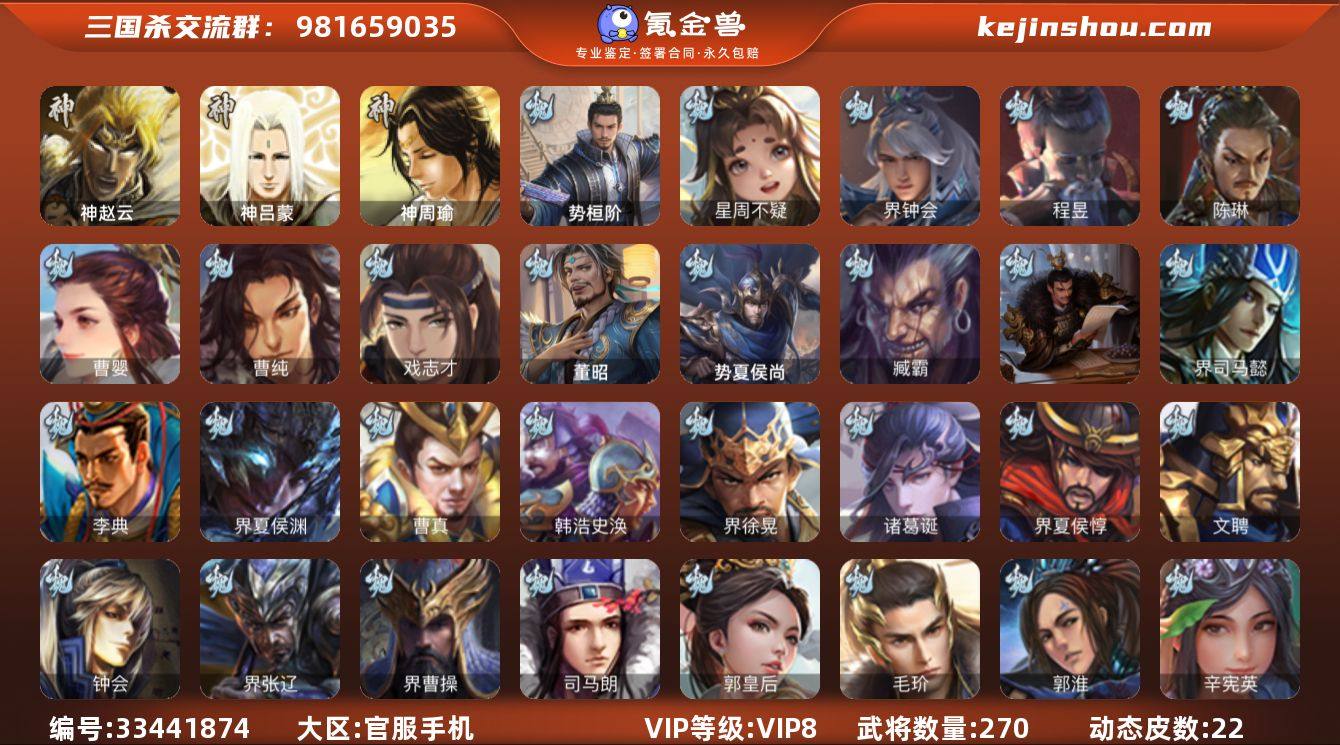 官阶:骠骑将军;VIP等级:VIP8;史诗武将数量:19;动态皮肤数量:22;武将总数:270;史诗宝珠数量:0;将魂数量:1948;神将:1;魏国史诗武将:14;蜀国史诗武将:3;吴国史诗武将:2;群史诗武将:5 神赵云,星周不疑,界钟会,陈琳,曹婴,曹纯,戏志才,程昱,势桓阶,马云騄,谋赵云,花鬘,界徐盛,贺齐,左慈,麹义,界李儒,友诸葛亮,兀突骨,神吕蒙,神周瑜,势夏侯尚,SP关羽,SP蔡文姬,乐进,曹昂,诸葛诞,朱灵,文聘,SP姜维,钟会,曹冲,郭淮,满宠,界王异,界曹操,界司马懿,界夏侯惇,界张辽,界许褚,界郭嘉,李典,曹真,韩浩史涣,陈群,曹叡,钟繇,司马朗,郭皇后,辛宪英,界甄姬,吕虔,鲁芝,界典韦,界荀彧,界徐晃,界曹丕,张恭,界曹植,界郭淮,华歆,蔡贞姬,崔琰,毛玠,谋徐晃,界夏侯渊,臧霸,董昭,SP孙尚香,夏侯霸,马良,关兴张苞,廖化,界马岱,关平,刘封,界法正,界关兴张苞,界刘备,界关羽,界马超,SP徐庶,吴懿,周仓,张松,刘谌,夏侯氏,糜竺,马忠,李严,界黄月英,严颜,界伊籍,界卧龙诸葛,界庞统,张翼,邓芝,界简雍,王甫赵累,刘巴,彭羕,谋庞统,界张嶷,谋张飞,吴班,霍峻,诸葛果,蒋琬费祎,孙茹,凌操,诸葛恪,诸葛瑾,孙鲁育,程普,韩当,潘璋马忠,虞翻,朱然,界甘宁,界吕蒙,界黄盖,界周瑜,界大乔,界陆逊,孙鲁班,朱桓,顾雍,孙休,全...