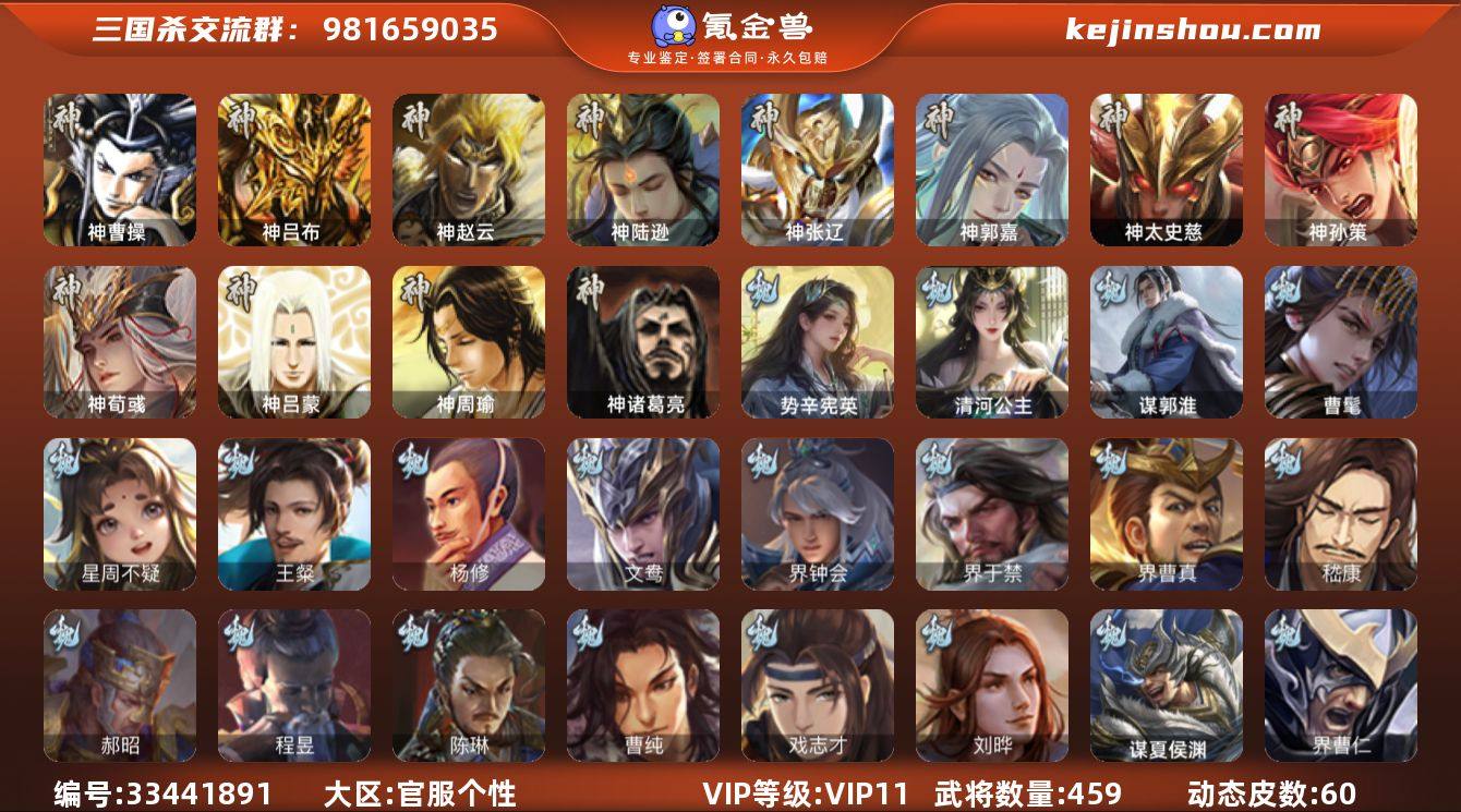 官阶:大将军;VIP等级:VIP11;史诗武将数量:66;动态皮肤数量:60;武将总数:459;史诗宝珠数量:1;将魂数量:143;神将:10;魏国史诗武将:32;蜀国史诗武将:13;吴国史诗武将:9;群史诗武将:21 神曹操,神吕布,神赵云,神陆逊,神张辽,神郭嘉,神太史慈,神孙策,神荀彧,神诸葛亮,曹髦,星周不疑,王粲,杨修,界钟会,界于禁,界曹真,嵇康,郝昭,陈琳,曹纯,戏志才,刘晔,清河公主,势辛宪英,程昱,关索,马云騄,谋赵云,谋马超,诸葛瞻,赵襄,张星彩,王平,沙摩柯,谯周,界黄忠,花鬘,董允,吴景,孙皓,骆统,界朱然,贺齐,势陆郁生,势太史慈,文鸯,左慈,郑玄,张让,星甘宁,审配,麹义,庞德公,刘焉,沮授,界李儒,公孙康,卑弥呼,谋张角,许攸,星董卓,笮融,兀突骨,士燮,司马昭,谋郭淮,神吕蒙,神周瑜,势夏侯尚,SP关羽,SP曹仁,SP蔡文姬,乐进,曹昂,诸葛诞,朱灵,文聘,SP姜维,张春华,钟会,曹冲,郭淮,满宠,界王异,界曹操,界司马懿,界夏侯惇,界张辽,界许褚,界郭嘉,李典,曹真,韩浩史涣,陈群,曹叡,曹休,钟繇,司马朗,王基,李通,郭皇后,孙资刘放,辛宪英,界甄姬,吕虔,鲁芝,蒯越蒯良,界典韦,界荀彧,界徐晃,杜畿,界曹丕,毌丘俭,界邓艾,张恭,贾逵,界曹植,界曹彰,界满宠,界郭淮,卞夫人,辛毗,华歆,蔡贞姬,袁涣,王双,崔琰,毛玠,杨阜...