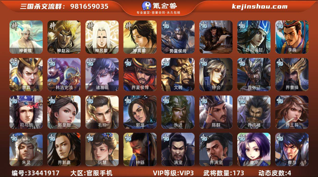 神赵云,神姜维,界徐盛,神吕蒙,神周瑜,势夏侯尚,SP关羽,乐进,曹昂,诸葛诞,朱灵,文聘,SP姜维,钟会,曹冲,郭淮,满宠,界王异,界曹操,界司马懿,界夏侯惇,界张辽,界许褚,界郭嘉,李典,曹真,韩浩史涣,陈群,钟繇,司马朗,郭皇后,界满宠,毛玠,阮慧,夏侯霸,马良,关兴张苞,廖化,界马岱,刘封,界法正,界关兴张苞,界刘备,界关羽,界张飞,界赵云,界马超,SP徐庶,吴懿,周仓,张松,刘谌,马忠,黄皓,谋张飞,糜芳傅士仁,凌操,诸葛瑾,孙鲁育,程普,韩当,虞翻,界甘宁,界黄盖,界周瑜,界大乔,界陆逊,孙鲁班,朱桓,孙休,潘濬,吕岱,卫温诸葛直,界潘璋马忠,孙邵,陈武董袭,谋诸葛瑾,界小乔,孟达,伏完,界袁术,SP赵云,张宝,伏皇后,李儒,华雄,袁术,界华佗,界吕布,公孙瓒,蔡夫人,公孙渊,界貂蝉,SP太史慈,李傕,界庞德,刘繇,张绣,星张辽,谋刘赪,势田丰,乐就,诸葛果-蛇年限定(动态),鲁肃-蛇年端午(动态)