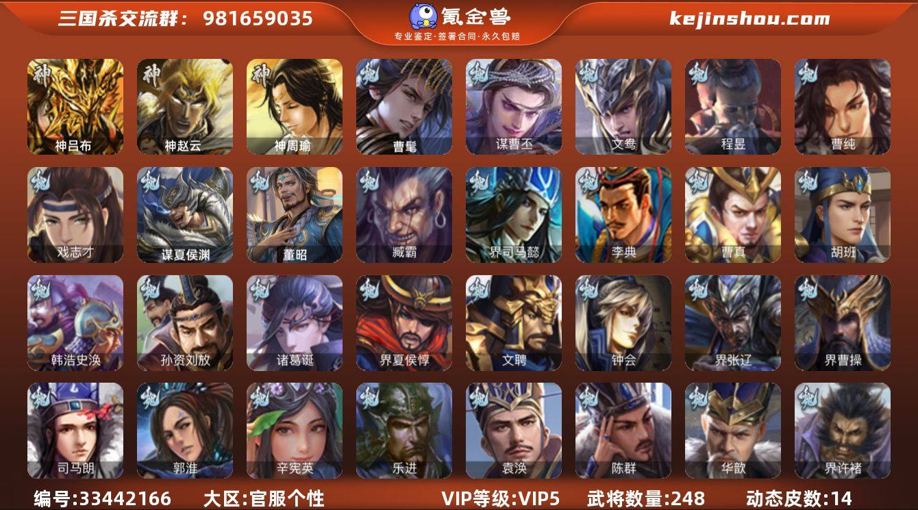 官阶:骠骑将军;VIP等级:VIP5;史诗武将数量:20;动态皮肤数量:14;武将总数:248;史诗宝珠数量:3;将魂数量:3836;神将:2;魏国史诗武将:6;蜀国史诗武将:5;吴国史诗武将:3;群史诗武将:6