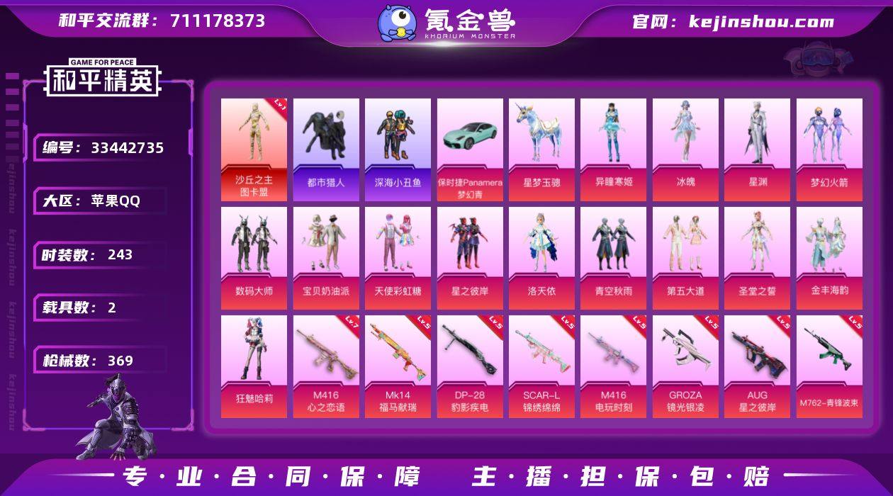 【kyhp1950】苹果 手Q-1神装-14粉装-15特效枪-2载具-10粉色飞行器-113978热力值-25王牌印记-243套装-369枪皮 【红色神装等级】:沙丘之主-图卡盟(一级) 【红色角色神装】:沙丘之主-图卡盟 【热门品类】:粉装-梦幻火箭,套装-浪漫天命,套装-都市猎人,套装-深海小丑鱼,套装-小丑鱼,角色-军刀雅典娜,套装-金羽特工,套装-龟仙人,套装-暗影哥特,套装-粉红小猪 【粉色套装】:粉装-数码大师,粉装-宝贝奶油派,粉装-天使彩虹糖,粉装-梦幻火箭,粉装-星之彼岸,角色-洛天依,粉装-青空秋雨,粉装-第五大道,角色-圣堂之誓,粉装-金丰海韵,角色-狂魅哈莉,角色-冰魄,角色-星渊,角色-异瞳寒姬 【粉色枪皮等级】:SCAR-L-甜梦小狐(一级),SCAR-L-锦绣绵绵(五级),SCAR-L-灵驹仙姬(三级),M416-心之恋语(七级),M416-电玩时刻(五级),GROZA-镜光银凌(五级),AUG-星之彼岸(五级),M762-青锋波束(五级),蜜獾-异瞳寒姬(四级),ACE32-萌骑漫游(二级),UMP45-量子极限(五级),Kar98K-巳巳如意(五级),Mk14-福马献瑞(五级),M249-绝对恒星(四级),DP-28-豹影疾电(五级) 【粉色载具】:保时捷Panamera(梦幻青),星梦玉骢 【粉色枪皮】:SCAR-L-甜梦小狐,SCAR-L-锦绣绵绵,SCAR...
