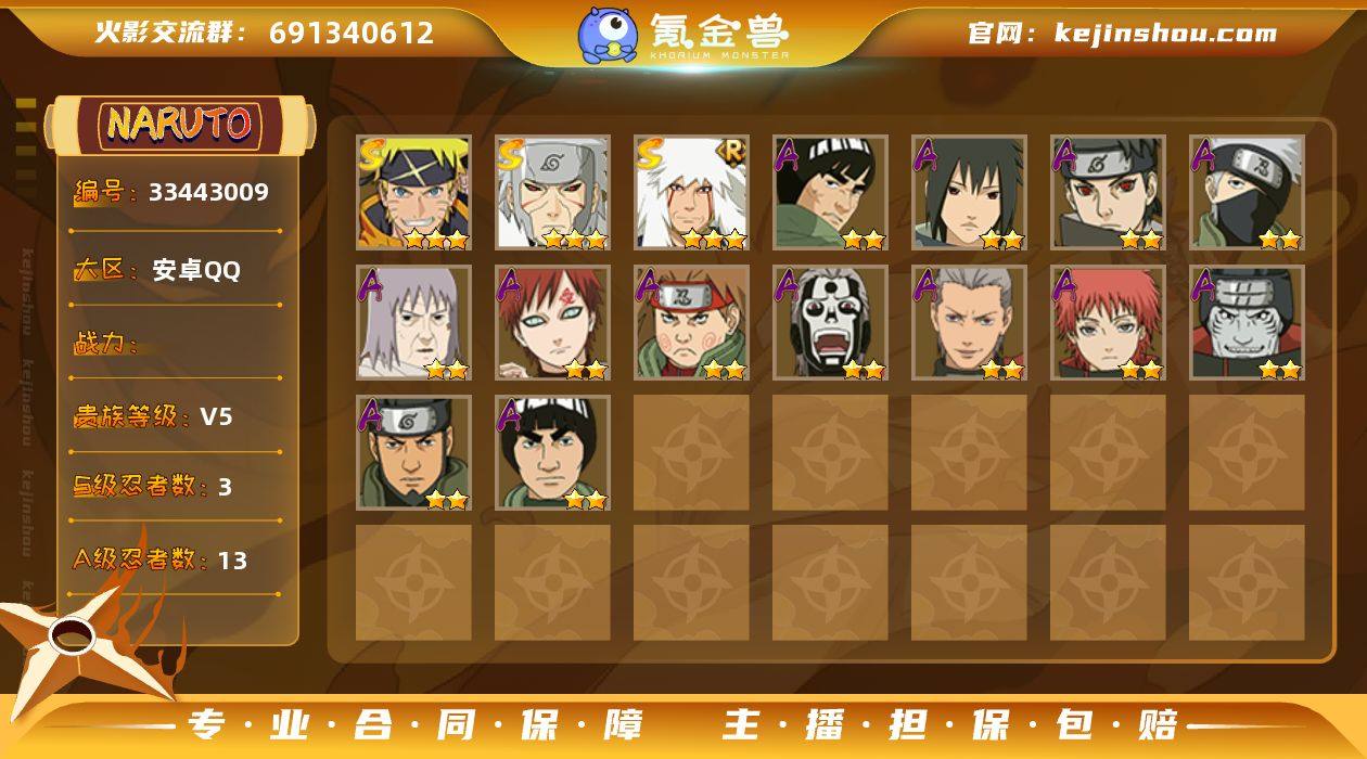 【YX452】可实名-3S级忍者数-13A级忍者数【S级忍者】:千手扉间「秽土转生」(3星),自来也「舞之豪杰」(3星),漩涡鸣人·宇智波佐助(3星)【A级忍者】:飞段(2星),飞段「死司凭血」(2星),干柿鬼鲛(2星),迈特凯(2星),旗木卡卡西「忍界大战」(2星),我爱罗「忍界大战」(2星),蝎(2星),猿飞阿斯玛(2星),宇智波止水(2星),秋道丁次「忍界大战」(2星),千代「近松十人卫」(2星),宇智波泉奈(2星),迈特凯「青春爆炸」(2星)
