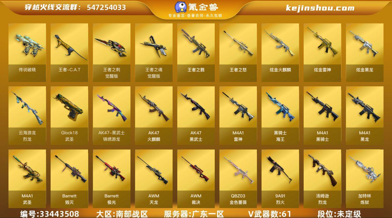 广东一区-74V-16王者武器数-4炫金武器数 【传说武器】:传说破晓 【热门武器】:传说破晓,QBZ03-金色蔷薇,M200-竞技荣光,荣耀世冠-雷神,荣耀世冠-柯尔特,C.A.T,M4A1-黑骑士,汤姆逊-烈龙*5,加特林-炼狱,雷神-小红,USP-雷暴,沙鹰-修罗 【王者炫金武器】:王者之戮,王者之怒,高爆手雷-雷霆王者*2,烟雾弹-雷霆王者*2,闪光弹-雷霆王者,炫金火麒麟,炫金黑龙*2,炫金雷神 【音效卡】:AK47-火麒麟音效卡,M4A1-雷神音效卡,M4A1-黑骑士音效卡,Barrett-毁灭音效卡,Barrett-极光音效卡,AWM-裁决音效卡,Scar Light-白虎音效卡,Barrett-碧霄极光音效卡 【皮肤】:AWM-裁决-百城联赛天津皮肤,AWM-裁决-凤灵皮肤,雷神-荣耀之魄,雷神-机甲刑天皮肤,雷神-海滩派对 皮肤,火麒麟-轻羽皮肤,火麒麟-平天大圣,火麒麟-百城,毁灭-荣耀之怒,毁灭-黑大圣皮肤,毁灭-魔灵皮肤,黑龙-能量核心,黑骑士-暗月,黑骑士-地狱火*2,天启-暗月*2,AWM-天龙-传奇70KG,AWM-天龙-传奇白鲨,极光-能量核心*3,修罗-CF STAR,修罗-星空,天神-暗月,屠龙-荣耀之锋,屠龙-荣耀世冠AG,屠龙-春桃 皮肤,龙啸-醒狮 皮肤,擎天-蒸汽钟表 皮肤,麒麟刺-萌杀皮肤 【角色】:葵,樱,电竞...