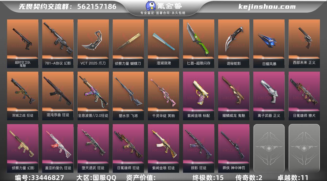 【套装】:VCT 2025 赛季套装 【英雄】:幻棱,炼狱,维斯,暮蝶,钛狐,壹决,铁臂,捷风,雷兹,幽影,不死鸟,贤者,猎枭,蝰蛇,零,芮娜,奇乐,尚勃勒,霓虹,斯凯,夜露,星礈,K/O,海神,盖可,黑梦,钢锁 【近战武器】:近战武器-碎心裂刃,近战武器-侦察力量 蝴蝶刀,近战武器-VCT 2025 爪刀,近战武器-黑波之刃,近战武器-澄湖潋滟,近战武器-超限闪存 匕首,近战武器-诡秘蛇影 军刀,近战武器-日耀风暴 遗器 【狂徒】:狂徒-混沌序曲,狂徒-全息波普//2.0,狂徒-双城之战,狂徒-堕天遗武,狂徒-掠影,狂徒-盖亚的复仇,狂徒-日冕雄师,狂徒-紫阙金琅,狂徒-诡秘蛇影 【幻影】:幻影-781-A协议,幻影-侦察力量,幻影-超限闪存,幻影-末日之翼 【戍卫】:戍卫-浮光跃金,戍卫-折光棱晶 【獠犬】:獠犬-日冕雄师,獠犬-模拟赫兹 【冥驹】:冥驹-千灵华绽,冥驹-模拟赫兹 【飞将】:飞将-塑水宗,飞将-末日之翼 【莽侠】:莽侠-神中神罚,莽侠-超限闪存,莽侠-诡秘蛇影 【战神】:战神-浮光跃金 【奥丁】:奥丁-末日之翼 【判官】:判官-诡秘蛇影 【雄鹿】:雄鹿-模拟赫兹 【骇灵】:骇灵-浮光跃金 【蜂刺】:蜂刺-超限闪存,蜂刺-折光棱晶 【标配】:标配-紫阙金琅...
