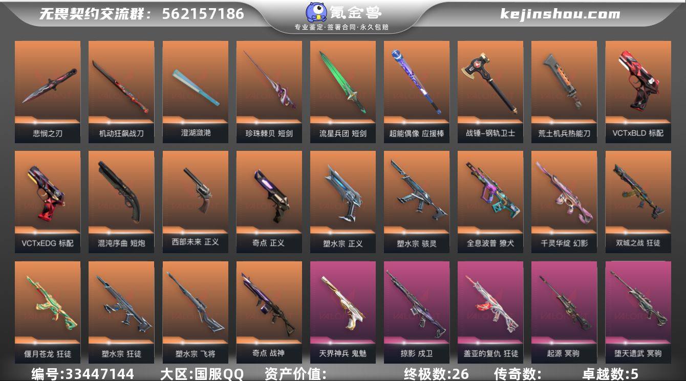 【套装】:无畏契约季前邀请赛套装,塑水宗套装,VCTxEDG 队伍套装 【英雄】:幻棱,炼狱,维斯,暮蝶,钛狐,壹决,铁臂,捷风,雷兹,幽影,不死鸟,贤者,猎枭,蝰蛇,零,芮娜,奇乐,尚勃勒,霓虹,斯凯,夜露,星礈,K/O,海神,盖可,黑梦,钢锁 【近战武器】:近战武器-无畏契约季前邀请赛 悲悯之刃,近战武器-剥皮小刀,近战武器-黑波之刃,近战武器-澄湖潋滟,近战武器-未来开拓者,近战武器-珍珠棘贝 短剑,近战武器-流星兵团 短剑,近战武器-超能偶像 应援棒,近战武器-钢轨卫士 战锤,近战武器-荒土机兵 热能刀,近战武器-机动狂飙 战刀,近战武器-天玄刀 【狂徒】:狂徒-双城之战,狂徒-塑水宗,狂徒-偃月苍龙,狂徒-盖亚的复仇,狂徒-超能偶像,狂徒-钢轨卫士,狂徒-荒土机兵,狂徒-流星兵团,狂徒-诡秘蛇影 【幻影】:幻影-千灵华绽,幻影-珍珠棘贝,幻影-聚合之力,幻影-纳米打击,幻影-战术小伙伴,幻影-末日之翼 【戍卫】:戍卫-掠影,戍卫-超能偶像,戍卫-钢轨卫士,戍卫-珍珠棘贝,戍卫-逆冲蛮牛,戍卫-战术熊与伙伴们,戍卫-折光棱晶 【獠犬】:獠犬-全息波普,獠犬-采蜜小蜂队,獠犬-复古浪潮,獠犬-逆冲蛮牛,獠犬-战术小伙伴 【冥驹】:冥驹-堕天遗...