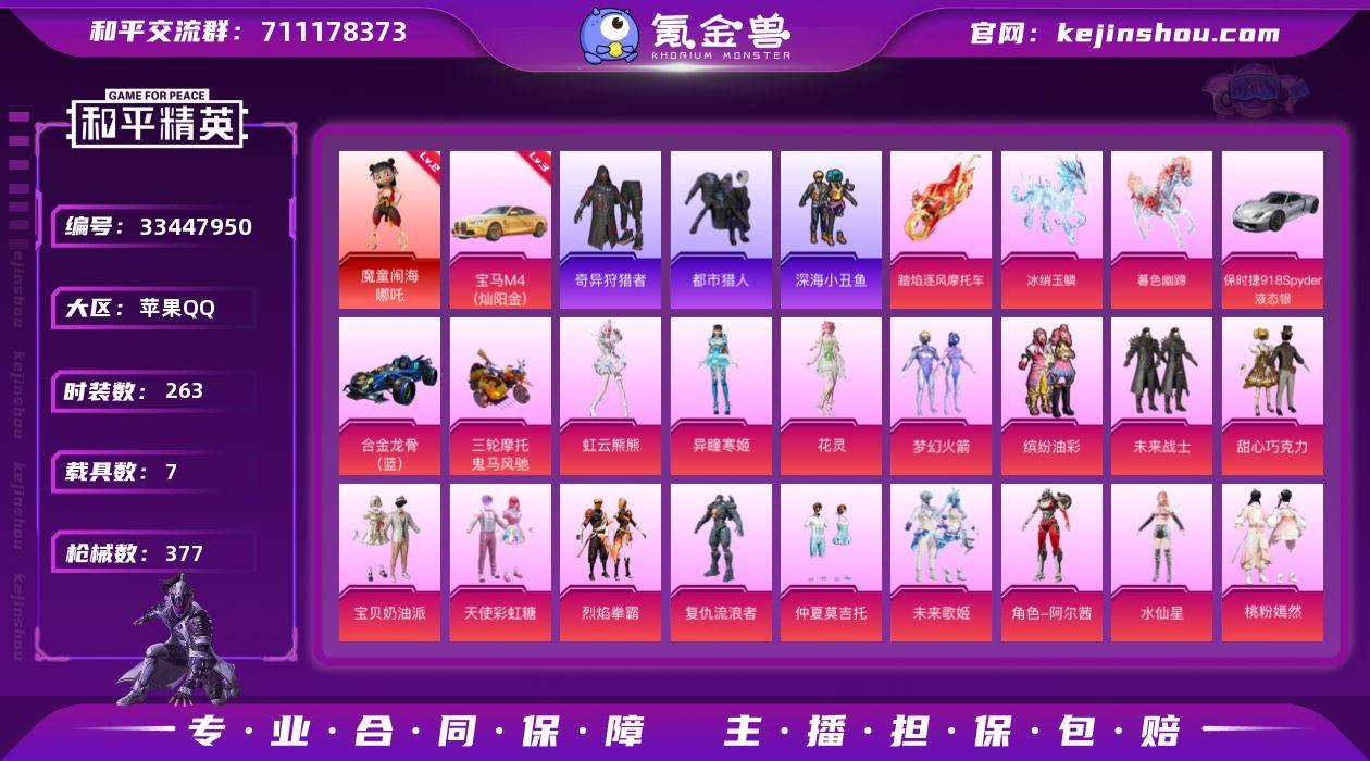 苹果 手Q-1神装-18粉装-12特效枪-7载具-8粉色飞行器-139271热力值-20王牌印记-263套装-377枪皮 【红色载具】:宝马M4(灿阳金)(三级) 【红色神装等级】:魔童闹海-哪吒(二级) 【红色角色神装】:魔童闹海-哪吒 【热门品类】:粉装-梦幻火箭,粉装-缤纷油彩,套装-浪漫天命,套装-都市猎人,套装-深海小丑鱼,套装-小丑鱼,套装-奇异狩猎者,套装-金羽特工,套装-忍者信条,角色-忠真马岱,套装-龟仙人,套装-暗影哥特,套装-浪漫波比,套装-粉红小猪,角色-Mark.06,角色-六号稻草人,大砍刀-青龙偃月刀,撬棍-龙胆亮银枪,套装-红熊茄茄 【粉色套装】:粉装-未来战士,粉装-甜心巧克力,粉装-宝贝奶油派,粉装-天使彩虹糖,粉装-梦幻火箭,粉装-缤纷油彩,粉装-烈焰拳霸,角色-复仇流浪者,粉装-仲夏莫吉托,粉装-未来歌姬,角色-阿尔茜,角色-水仙星,粉装-桃粉嫣然,角色-罗征,角色-荧海星豚,角色-花灵,角色-异瞳寒姬,角色-虹云熊熊 【粉色枪皮等级】:AKM-梦之光华(七级),AKM-绿萝繁花(五级),SCAR-L-梦幻火箭(四级),SCAR-L-魔童闹海 哪吒(九级),M416-心之恋语(七级),GROZA-香水柠檬(七级),Kar98K-巳巳如意(五级),Mk14-樱桃泡泡(六级),Mk14-福马献瑞(四级),A...