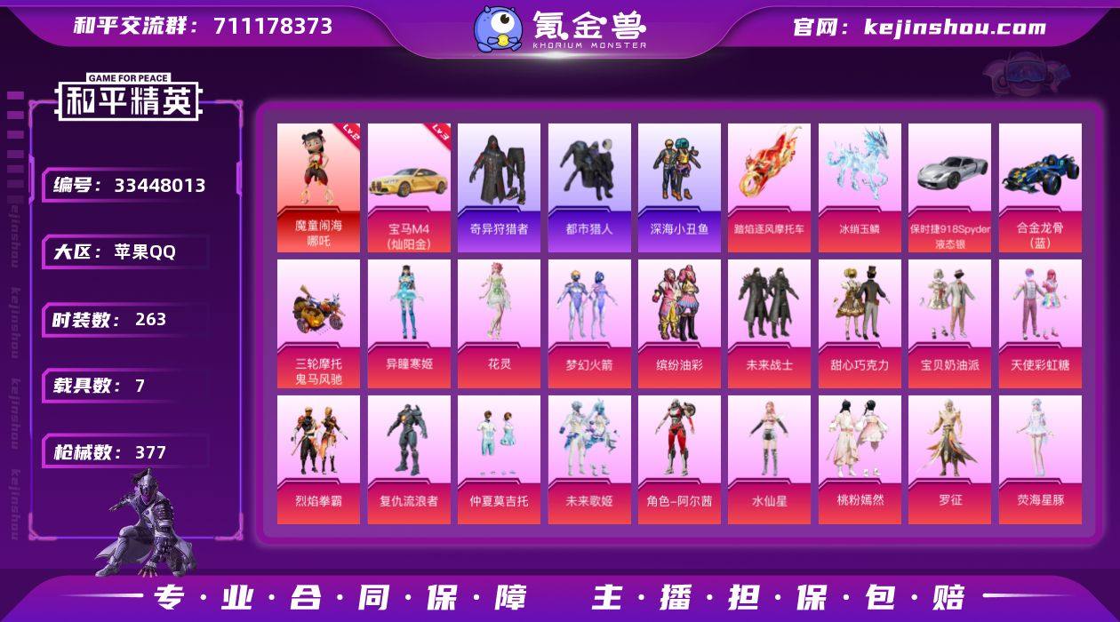 苹果 手Q-1神装-18粉装-12特效枪-7载具-8粉色飞行器-139271热力值-20王牌印记-263套装-377枪皮 【红色载具】:宝马M4(灿阳金)(三级) 【红色神装等级】:魔童闹海-哪吒(二级) 【红色角色神装】:魔童闹海-哪吒 【热门品类】:粉装-梦幻火箭,粉装-缤纷油彩,套装-浪漫天命,套装-都市猎人,套装-深海小丑鱼,套装-小丑鱼,套装-奇异狩猎者,套装-金羽特工,套装-忍者信条,角色-忠真马岱,套装-龟仙人,套装-暗影哥特,套装-浪漫波比,套装-粉红小猪,角色-Mark.06,角色-六号稻草人,大砍刀-青龙偃月刀,撬棍-龙胆亮银枪,套装-红熊茄茄 【粉色套装】:粉装-未来战士,粉装-甜心巧克力,粉装-宝贝奶油派,粉装-天使彩虹糖,粉装-梦幻火箭,粉装-缤纷油彩,粉装-烈焰拳霸,角色-复仇流浪者,粉装-仲夏莫吉托,粉装-未来歌姬,角色-阿尔茜,角色-水仙星,粉装-桃粉嫣然,角色-罗征,角色-荧海星豚,角色-花灵,角色-异瞳寒姬,角色-虹云熊熊 【粉色枪皮等级】:AKM-梦之光华(七级),AKM-绿萝繁花(五级),SCAR-L-梦幻火箭(四级),SCAR-L-魔童闹海 哪吒(九级),M416-心之恋语(七级),GROZA-香水柠檬(七级),Kar98K-巳巳如意(五级),Mk14-樱桃泡泡(六级),Mk14-福马献瑞(四级),A...