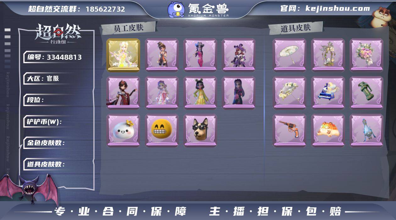 金皮1;紫皮7;道具皮10;皮肤:兰-春之声,爱丽丝-耀眼的你,阿念-庆宴绮愿,薇薇安-仙锋小姐,小黄-呱呱雨衣,爱丽丝-甜梦派对,兰-千夜星谕,爱丽丝-丝缕哀歌;道具:伞-郁金春信,伞-沐春颂,额外的背包-灵感泉之花,音响-月光奏鸣曲,转轮手枪-新星时代,音响-咏叹调,急救包-蔷薇物语,腰包-红运福虎,黄牛能量饮料-青玉抱丹,闪光弹-金戈玄铜;饰品:头饰-嘻嘻头套,头饰-哈士奇头套,头饰-蒜了八,头饰-芝麻糊汤圆,头饰-鱼头怪头套,头饰-青团糯糯,头饰-惊魂南瓜头套,头饰-面具马头套,头饰-饺饺者头套,头饰-烈焰红唇头套,头饰-烛光纪念,头饰-樱桃奶油布丁,头饰-马上有钱,头饰-萨卡班甲鱼头套,头饰-雪墩墩头套,头饰-太空鲨头套,头饰-滑稽头套,头饰-煤球喵头套,头饰-呆滞头套,头饰-卑微头套,头饰-像素朋克墨镜,头饰-后室幸存者头套,挂饰-晚安小熊,挂饰-孤独对望,挂饰-桂冠聆诗,挂饰-春信香囊,背饰-侧耳倾听,背饰-牛啤背包,背饰-放青松;动作:动作-企鹅舞,动作-舞台中心,动作-新年摇,动作-姬芽摇,动作-抖肩舞,动作-抬手,动作-要糖,动作-举牌,动作-拜年;工牌背景:工牌背景-珊瑚海,工牌背景-春和景明,工牌背景-流金照庭,工牌背景-甜心的囚笼;工牌动作:工牌动作-元气剪刀手,工牌动作-春色盈...