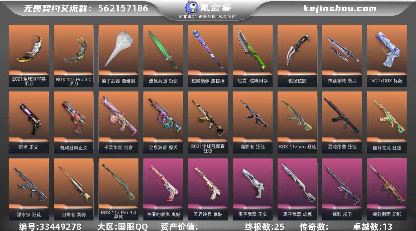【套装】:2021全球冠军赛套装,离子武器套装 【英雄】:幻棱,炼狱,维斯,暮蝶,钛狐,壹决,铁臂,捷风,雷兹,幽影,不死鸟,贤者,猎枭,蝰蛇,零,芮娜,奇乐,尚勃勒,霓虹,斯凯,夜露,星礈,K/O,海神,盖可,黑梦,钢锁 【近战武器】:近战武器-2021全球冠军赛 爪刀,近战武器-RGX 11z Pro//3.0 爪刀,近战武器-镭切,近战武器-威龙之刃,近战武器-离子武器 能量剑,近战武器-流星兵团 短剑,近战武器-超能偶像 应援棒,近战武器-超限闪存 匕首,近战武器-洪荒双斩,近战武器-魄月玄刃,近战武器-诡秘蛇影 军刀,近战武器-神圣领域 战刀 【狂徒】:狂徒-2021全球冠军赛,狂徒-混沌序曲,狂徒-塑水宗,狂徒-偃月苍龙,狂徒-噬影者,狂徒-RGX 11z Pro,狂徒-盖亚的复仇,狂徒-海洋之星,狂徒-赤焰铁骥,狂徒-超能偶像,狂徒-流星兵团,狂徒-诡秘蛇影 【幻影】:幻影-般若假面,幻影-离子武器,幻影-侦察力量,幻影-超限闪存,幻影-神圣领域,幻影-聚合之力,幻影-末日之翼 【戍卫】:戍卫-掠影,戍卫-超能偶像,戍卫-珍珠棘贝,戍卫-浮光跃金,戍卫-战术熊与伙伴们,戍卫-月球哨兵,戍卫-折光棱晶 【獠犬】:獠犬-全息波普,獠犬-神圣领域,獠犬-采蜜小蜂队,獠犬-复...