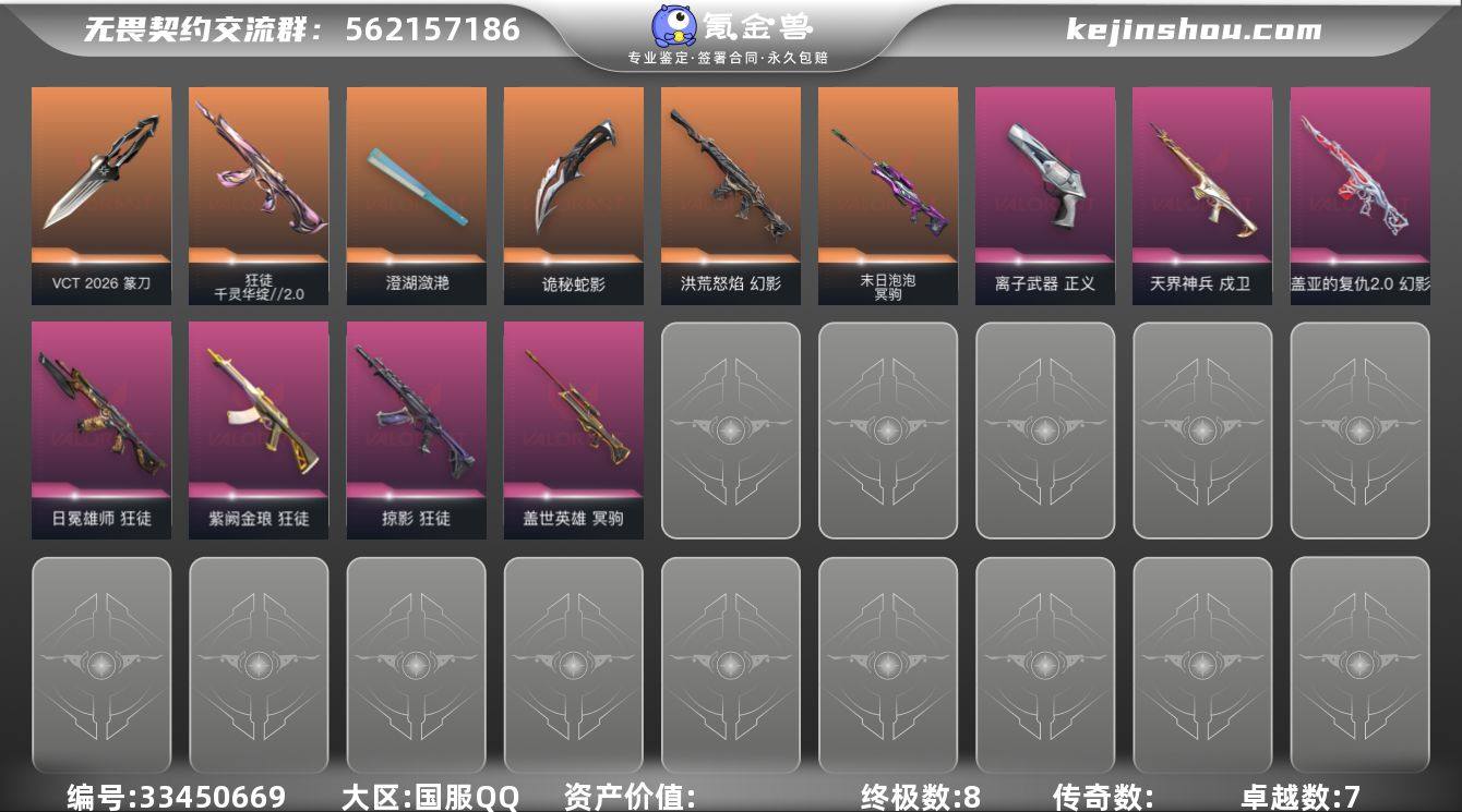 L3368【精品号】vct篆刀 洪荒幻影 天界戍卫 末日冥驹 莲花狂徒 日冕狂徒 盖世冥驹 影钩 离子正义 掠夺狂徒 紫金狂徒 诡秘军刀 澄湖扇子库存: 25120剩余VP:32剩余R点:5 段位:铂金1历史最高:铂金1