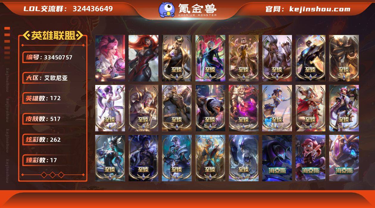 t37782【艾欧尼亚】510皮肤 259炫彩 16臻彩 27神话/49限定/48传说/172英雄 账号等级:1315 单双排段位:铂金 【重要头像】星守阿狸 觅心之翼奎因 银河魔装机神安妮 萨勒芬妮超级巨星 萨勒芬妮独立音乐人 击拳 KDA萨勒芬妮 【重要皮肤】机神玄武盖伦至臻 T1杰斯至臻 至高天凯尔至臻 青花瓷千珏至臻 天龙之子伊泽瑞尔至臻 北极星钢影卡蜜尔至臻 墨之影武者亚索至臻 星之守护者辛德拉至臻 幻灵战斗猫金克丝至臻 青花瓷拉克丝至臻 神凰行者烈羽焰凰霞至臻 女帝黛安娜至臻 源计划逆流塞拉斯至臻 源计划阴劫至臻 神龙尊者均衡之龙沃利贝尔至臻 KDA二代卡莎至臻 KDA阿狸至臻 魅惑女巫厄运小姐至臻 未来战士锤石至臻 殿堂传奇乐芙兰 海克斯科技安妮 海克斯科技克格莫 海克斯科技魔腾 西部魔影炽天使永恩 黎明使者卡尔玛 胜利剑圣易 胜利女神娑娜 胜利之王泰达米尔 胜利巨口克格莫 荣誉使者玛尔扎哈 电玩女神厄运小姐 玉剑传说无影 女帝厄运小姐 玉剑传说无劫 玉剑传说舞龙卫 点心宝贝阿木木 天龙之子斯莫德 玉净夜叉凯特琳 紫金罗刹莫甘娜 纳财大帝塔姆 龙马烈焰波比 甜心之翎洛 北极星守护者赫卡里姆 雪球也能爆炸吉格斯 冰雪驯鹿波比 魄罗骑士瑟庄妮 魅惑女巫厄运小姐 御星魔矢艾希 F...