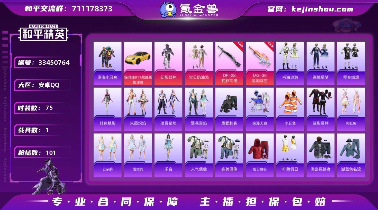 无二次安卓手Q-3粉装-5特效枪-1载具-2粉色飞行器-28247热力值-4王牌印记-75套装-101枪皮 【热门品类】:套装-浪漫天命,套装-深海小丑鱼,套装-小丑鱼,套装-暗影哥特 【粉色套装】:粉装-幻影战神,粉装-宝贝奶油派,角色-月中灵 【粉色枪皮等级】:ACE32-萌骑漫游(二级),AKS-74U-森灵之息(五级),Mk14-福马献瑞(五级),DP-28-豹影疾电(五级),MG-36-沧焰双生(五级) 【粉色载具】:保时捷911 敞篷版(极速黄) 【粉色枪皮】:ACE32-萌骑漫游,AKS-74U-森灵之息,Mk14-福马献瑞,DP-28-豹影疾电,MG-36-沧焰双生 【粉色飞行器】:炫彩糖果飞行器,梦幻火箭飞行器 【粉色降落伞】:绝对恒星降落伞,甜心宝贝降落伞,梦幻火箭降落伞,绯穹魔姬降落伞,喜羊羊与灰太狼降落伞,异瞳寒姬降落伞,炫彩糖果降落伞 【稀有套装】:套装-雪国风尚,套装-炫彩糖果,角色-X,套装-马上有钱,套装-迅捷龙虾,套装-彩虹兔,套装-云朵鹅,套装-雪绒豹,角色-乐音,套装-朱霞炽焰,套装-凌霄紫焰,套装-擎苍青焰,角色-绯色魅影,套装-书海巡游,套装-画境星梦,套装-琴音绮想,角色-霜刃之御,套装-雨过天青,套装-红釉青花 【稀有枪皮】:AUG-冰晶雪宝,AKM-影袭,AKM-破晓战魂,AKM-龙的传...