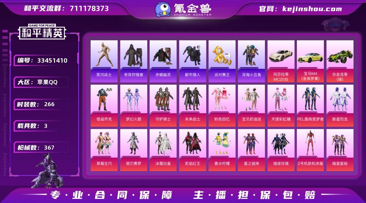 苹果 手Q-无敌战神框-20粉装-20特效枪-3载具-5粉色飞行器-138863热力值-29王牌印记-266套装-367枪皮 【热门品类】:粉装-怪诞乔克,粉装-梦幻火箭,套装-赤蝎幽灵,套装-都市猎人,套装-冥河战士,套装-派对舞王,套装-深海小丑鱼,套装-小丑鱼,套装-奇异狩猎者,角色-军刀雅典娜,套装-金羽特工,套装-忍者信条,套装-暗夜行者,套装-龟仙人,套装-潮萌小黄鸭,套装-暗影哥特,M416-星际漫游 【粉色套装】:粉装-守护骑士,粉装-未来战士,粉装-粉色回忆,粉装-怪诞乔克,粉装-宝贝奶油派,粉装-天使彩虹糖,粉装-梦幻火箭,粉装-PEL轰鸣竞梦者,粉装-新星烈龙,粉装-草莓生巧,粉装-银刃赛罗,粉装-冰霜白皇,粉装-炙焰红王,粉装-香水柠檬,粉装-星之彼岸,粉装-暗夜玫瑰,角色-2号机款机体服,粉装-暗星紫秘,粉装-飒粉甜心,粉装-星穹咏叹调 【粉色枪皮等级】:AKM-甜心宝贝(七级),AKM-梦之光华(一级),M16A4-垂柳戏鸭(四级),SCAR-L-梦幻火箭(一级),SCAR-L-童趣迷兔(六级),M416-五爪金龙(一级),M416-心之恋语(四级),M416-暖熊萌萌(一级),M416-至情至圣(九级),GROZA-焦糖拿铁(五级),AUG-星之彼岸(五级),M762-甜蜜誓约(五级),M762-甜心娃娃(一级),UMP45-相思...