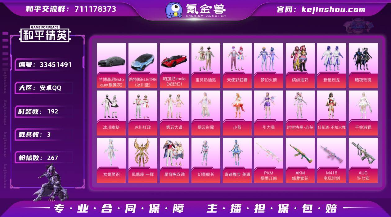 【957711】M1046538【网络公主号满天赋3载具-20粉装-7特效枪 猪妹 梦幻火箭 洛天依 激萌罗小黑 AUG-许七安满级】安卓手Q-3载具-20粉装-7特效枪-192套装-267枪皮-12王牌印记-坚韧铂金Ⅴ-91572热力值【3载具】路特斯ELETRE(冰川蓝),帕加尼imola(光影红),兰博基尼Estoque(银翼灰)【20粉装】角色-幻星舰长,角色-引力星,角色-凤凰座 一辉,缤纷油彩,冰川幽秘,角色-烟云彩露,暗夜玫瑰,时空协奏·心弦,角色-小蓝,新星烈龙,角色-千金淑猫,宝贝奶油派,角色-奇迹舞步 美琪,冰川红玫,天使彩虹糖,星穹咏叹调,角色-狂花道·不知火舞,梦幻火箭,第五大道,角色-女娲灵识【7特效枪】Kar98K-巳巳如意[5级],AKM-绿萝繁花[5级],DP-28-暗夜鎏金[7级],爆炸猎弓-拳皇·狂花道[7级],PKM-江南烟雨[7级],M416-电玩时刻[5级],AUG-许七安[7级]【1稀有】激萌罗小黑【8飞行器】顶峰精英尾迹,炫彩糖果飞行器,酣梦熊熊飞行器,异域银装飞行器,幻星舰长飞行器,破刃行动尾迹,鸿潮鸣舰飞行器,梦幻火箭飞行器【2头盔】甜心宝贝头盔,梦幻火箭头盔【2背包】梦幻火箭背包,甜心宝贝背包【431其它衣服和枪皮】音速流光,神气柴柴,夏日音浪,雪绒豹,和煦暖阳,SS30特训,SS31特训,青团波波,蓝彩潮人,SS20特训,SS15特训,瑞龙福将,玉...