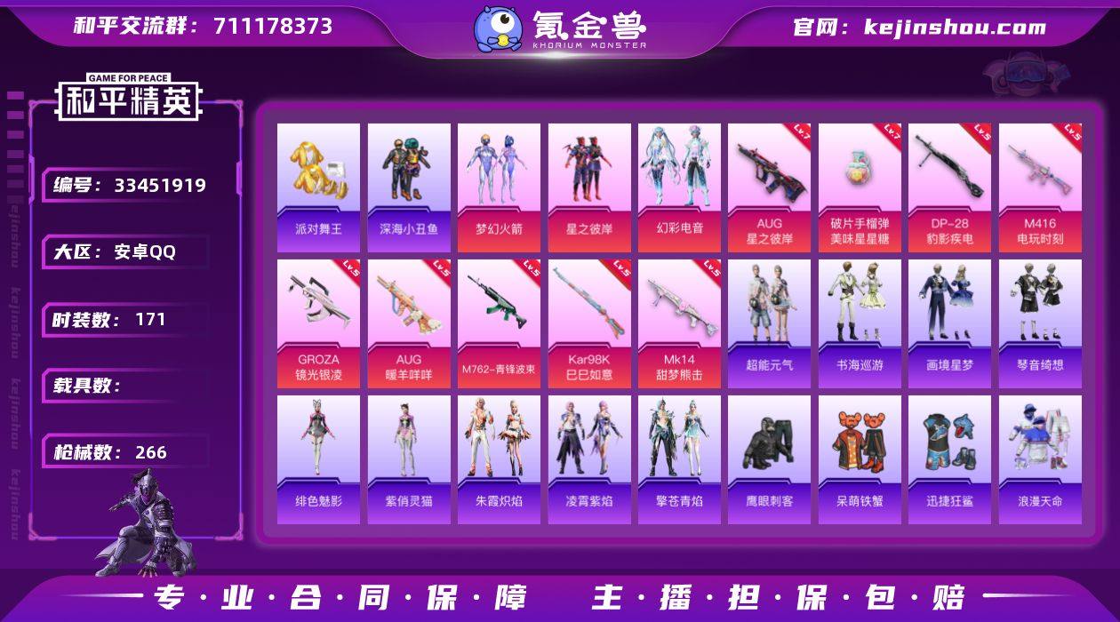 安卓 手Q-3粉装-13特效枪-0载具-1粉色飞行器-73207热力值-9王牌印记-171套装-266枪皮 【热门品类】:粉装-梦幻火箭,套装-浪漫天命,套装-派对舞王,套装-深海小丑鱼,套装-小丑鱼,套装-龟仙人,套装-暗影哥特 【粉色套装】:粉装-梦幻火箭,粉装-星之彼岸,粉装-幻彩电音 【粉色枪皮等级】:M416-电玩时刻(五级),GROZA-镜光银凌(五级),AUG-星之彼岸(七级),AUG-暖羊咩咩(五级),M762-青锋波束(五级),AKS-74U-森灵之息(五级),Kar98K-巳巳如意(五级),Mk14-甜梦熊击(五级),Mk14-福马献瑞(五级),AA12-G-萌骑幻想(三级),DP-28-豹影疾电(五级),燃烧瓶-天降桃花(五级),破片手榴弹-美味星星糖(七级) 【粉色枪皮】:M416-电玩时刻,GROZA-镜光银凌,AUG-星之彼岸,AUG-暖羊咩咩,M762-青锋波束,AKS-74U-森灵之息,Kar98K-巳巳如意,Mk14-甜梦熊击,Mk14-福马献瑞,AA12-G-萌骑幻想,DP-28-豹影疾电,燃烧瓶-天降桃花,破片手榴弹-美味星星糖 【粉色飞行器】:炫彩糖果飞行器 【粉色降落伞】:梦幻火箭降落伞,星之彼岸降落伞,闲梦青缨降落伞,精灵梦叶罗丽降落伞,星穹咏叹调降落伞,无垠阁降落伞,炫彩糖果降落伞,鸢尾珑雾降落伞 【稀有套装】:套装-龟仙人,套装-巳巳...