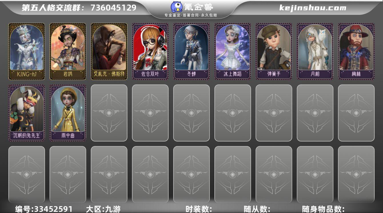 亮点:木偶师king-h1(带限定头像)杰克 札克套和红玫瑰手杖 魔术师岩鸽 机械师绒花之谜套 舞女 金 剪刀手爱德华联动皮 园丁牛仔 和若干深渊限定紫皮挂件