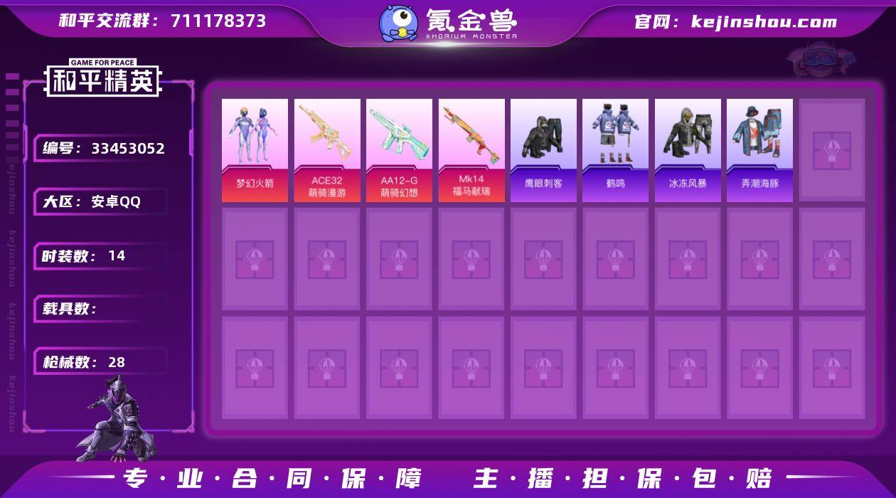 【957744】M1047059【1粉装-3特效枪梦幻火箭】安卓手Q-1粉装-3特效枪-14套装-28枪皮-0王牌印记-不朽星钻Ⅳ-7380热力值【1粉装】梦幻火箭【3特效枪】ACE32-萌骑漫游[2级],AA12-G-萌骑幻想[2级],Mk14-福马献瑞[4级]【1稀有】AKM-缤纷海域【2飞行器】云朵驼驼飞行器,星梦奇缘飞行器【2背包】深海小丑鱼背包,梦幻火箭背包【37其它衣服和枪皮】弄潮海豚,冰冻风暴,红釉青花,鹤鸣,SS37特训,街头潮人,狙击之神,雨过天青,星梦畅游,马上有钱,魅力单车,鹰眼刺客,福马献瑞,M16A4-雨过天青,沙漠之鹰-雨过天青,PKM-雨过天青,大砍刀-像素花束,GROZA-福马献瑞,汤姆逊-像素花束,AA12-G-雨过天青,AUG-甜蜜菠萝,Mk14-阳光菠萝,M416-糯团青竹,M249-糯团青竹,Kar98K-梦幻火箭,AUG-耀粉歌者,Mini14-梦幻火箭,P90-玩趣呆呆,M24-天降萌叽,蜜獾-天降萌叽,20-H-星梦奇缘,SKS-迅猛狂鲨,UZI-影袭,蜜獾-启元战纹,AMR-雨过天青,SLR-乌木金纹,DBS-绿洲时空