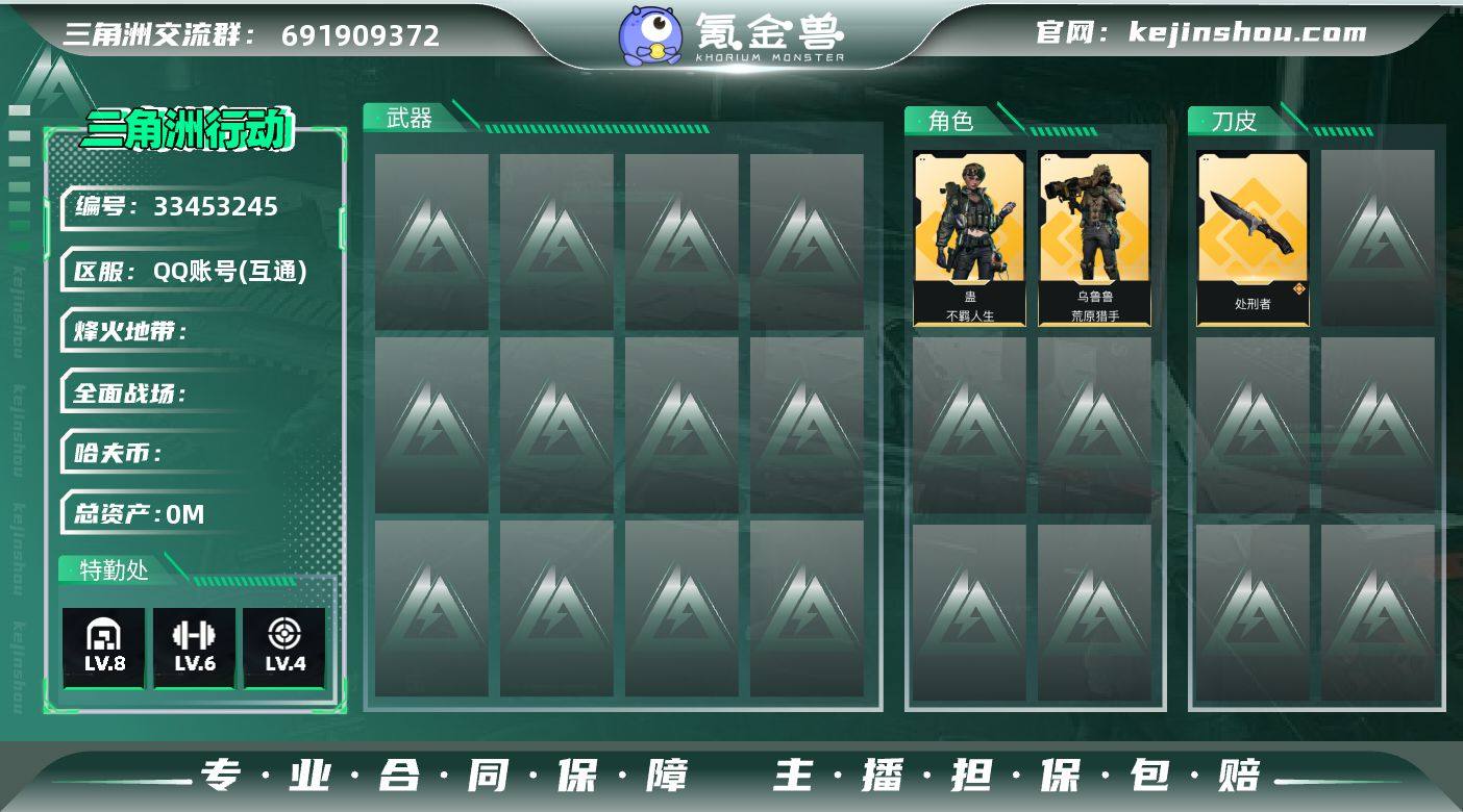 A12720/包人脸/QQ区【0封禁】【总资产:66.5M+近战处刑者】/烽火等级:60级/全面战场:5级/纯币:1815K/三角券加币:120(三角券120)【近战-处刑者】【乌鲁鲁-荒原猎手/蛊-不羁人生】/部门:22311/特勤等级(技术中心3级/工作台3级/制药台3级/防具台3级/仓库8级/指挥中心5级/训练中心6级/靶场4级/潜水中心2级/收藏室1级)(流动资产:37M)2橙色挂饰/段位:三角洲巅峰/详细看图