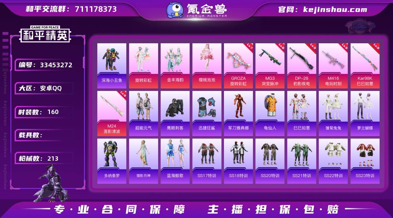 安卓 手Q-3粉装-10特效枪-0载具-1粉色飞行器-60559热力值-4王牌印记-160套装-213枪皮 【热门品类】:套装-深海小丑鱼,角色-军刀雅典娜,套装-龟仙人 【粉色套装】:粉装-旋转彩虹,粉装-金丰海韵,角色-樱桃泡泡 【粉色枪皮等级】:M416-电玩时刻(五级),GROZA-旋转彩虹(七级),ACE32-萌骑漫游(三级),AKS-74U-森灵之息(五级),Kar98K-巳巳如意(五级),M24-莲影清波(四级),Mk14-福马献瑞(五级),DP-28-豹影疾电(五级),MG3-突变脉冲(六级),信号枪-金乌曜日(四级) 【粉色枪皮】:M416-电玩时刻,GROZA-旋转彩虹,ACE32-萌骑漫游,AKS-74U-森灵之息,Kar98K-巳巳如意,M24-莲影清波,Mk14-福马献瑞,DP-28-豹影疾电,MG3-突变脉冲,信号枪-金乌曜日 【粉色飞行器】:炫彩糖果飞行器,六号石头人降落伞 【粉色降落伞】:绝对恒星降落伞,百万伏特降落伞,海渊国主降落伞,旋转彩虹降落伞,海螺星光降落伞,第五大道降落伞,萌物绒绒降落伞,精灵梦叶罗丽降落伞,冠军兔兔降落伞,创世·救赎降落伞,守护天翼降落伞,金丰海韵降落伞,忍者神龟降落伞,千金淑猫降落伞,圣斗士星矢降落伞,宁雨蝶降落伞,炫彩糖果降落伞 【稀有套装】:套装-龟仙人,套装-巳巳如意,套装-超能元气...