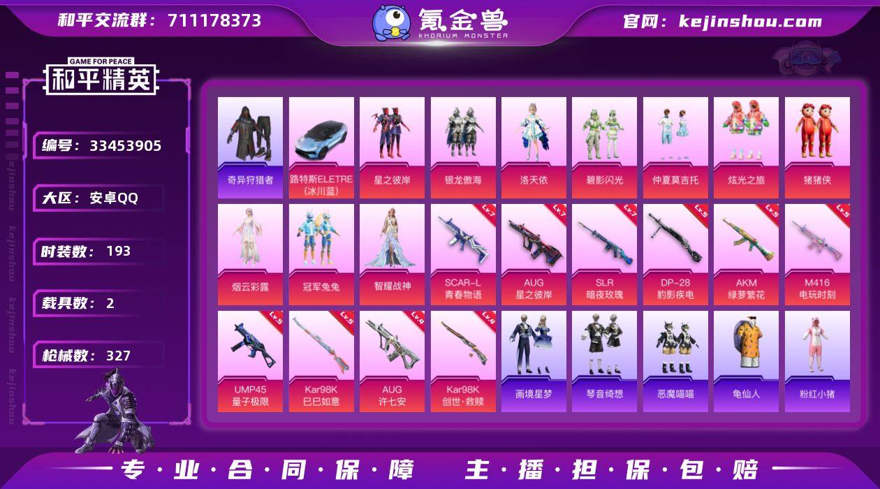 安卓 手Q-10粉装-14特效枪-2载具-7粉色飞行器-100177热力值-10王牌印记-193套装-327枪皮 【热门品类】:套装-奇异狩猎者,套装-龟仙人,套装-粉红小猪 【粉色套装】:粉装-星之彼岸,粉装-银龙傲海,角色-洛天依,粉装-碧影闪光,粉装-仲夏莫吉托,粉装-炫光之旅,玩偶服-猪猪侠,角色-烟云彩露,粉装-冠军兔兔,角色-智耀战神 【粉色枪皮等级】:AKM-绿萝繁花(五级),SCAR-L-青春物语(七级),M416-电玩时刻(五级),AUG-星之彼岸(七级),AUG-许七安(四级),ACE32-萌骑漫游(五级),UMP45-量子极限(五级),AKS-74U-森灵之息(四级),Kar98K-创世·救赎(四级),Kar98K-巳巳如意(五级),Mk14-福马献瑞(五级),SLR-暗夜玫瑰(七级),AA12-G-萌骑幻想(二级),DP-28-豹影疾电(五级) 【粉色载具】:路特斯ELETRE(冰川蓝),纱华曳影 【粉色枪皮】:AKM-绿萝繁花,SCAR-L-青春物语,M416-电玩时刻,AUG-星之彼岸,AUG-许七安,ACE32-萌骑漫游,UMP45-量子极限,AKS-74U-森灵之息,Kar98K-创世·救赎,Kar98K-巳巳如意,Mk14-福马献瑞,SLR-暗夜玫瑰,AA12-G-萌骑幻想,DP-28-豹影疾电 【粉色飞行器】:炫彩糖果飞行器,星之彼岸飞行器,庄周梦蝶飞行器,萌物绒绒飞行器,祥瑞锦鲤飞行器,...