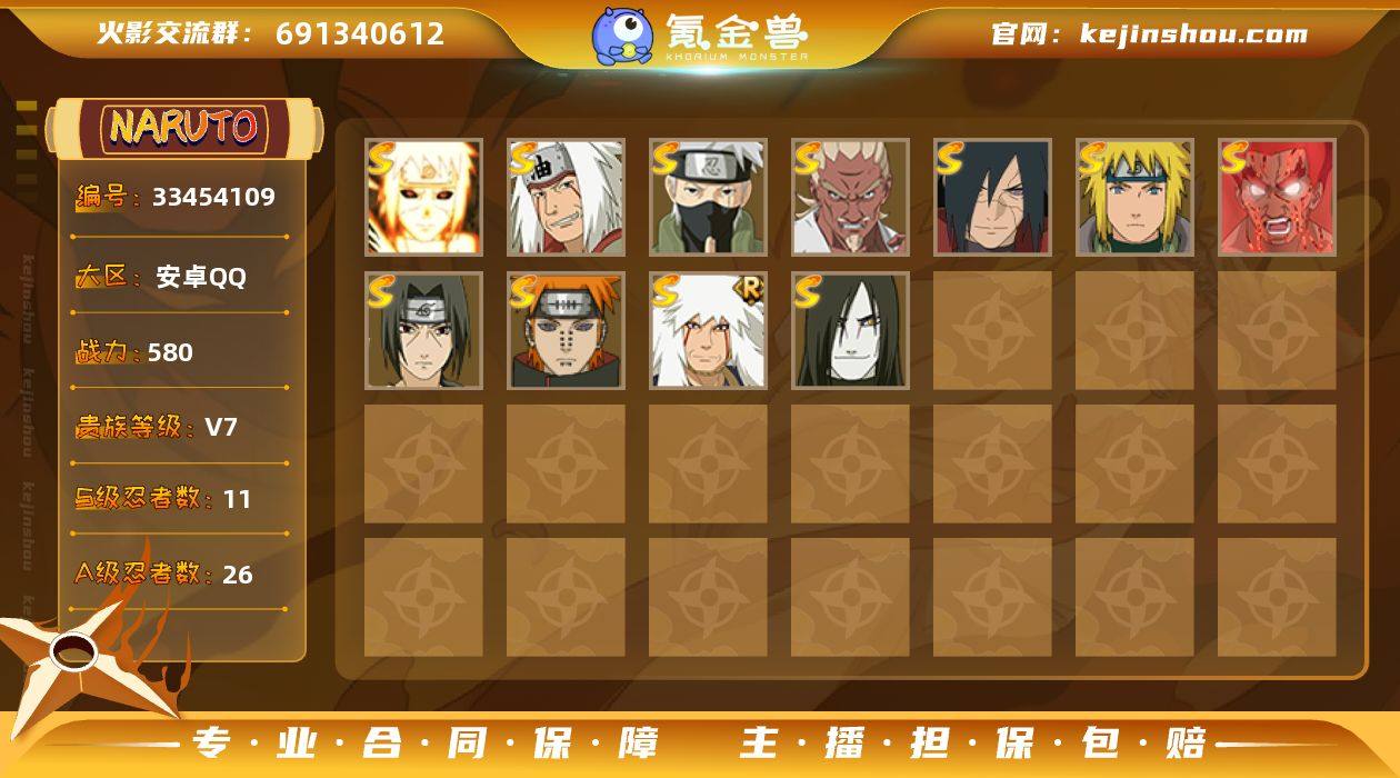 实名: 可修改 贵族等级: V7 S忍数: 11 A忍数: 26 战力值(万): 580 S级忍者: 佩恩「天道」,大蛇丸,波风水门,宇智波鼬 「须佐能乎」,迈特凯「死门」,自来也 「舞之豪杰」,宇智波斑「秽土转生·解」,艾「忍界大战」,旗木卡卡西「须佐能乎」,自来也 「传说中的三忍」,波风水门「九喇嘛连结」 亮点: 【优质装备】:迈特凯「死门」,宇智波斑「秽土转生·解」,艾「忍界大战」,旗木卡卡西「须佐能乎」,自来也 「传说中的三忍」霸体lv6