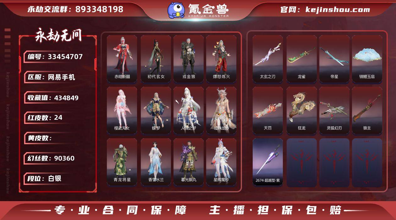 WJ6097,网易手机,5月16可换绑,三人段位白银1,声望5,24红,703金,等级448,收藏值434849,幻丝90360,金砖0,通行证Lv1,变身器,金人俑,千秋匠心凶虎,夜蔷薇,绿野守护竹韵悠,2674初代机,珥冰,神乌造像,葫芦兄弟三娃葫芦,观山海春木,御祥云,炎烈珠,红色神品,炎魄焚心,香雪水兰,暮光胴丸,星辉魔纱,流金晓锦,守墨麒,戎金狼,赤皓新囍,初代玄女,熛怒炼火,樱云天女,蝶梦,人偶之梦,泣珠龙纱,青龙将星,天罚,帝星,龙雀,狼主,锦鲤玉扇,狂龙,太玄之刃,灵狐幻刃,2674超越型紫,角色金色皮肤,P5R雨宫莲JOKER,黄庭道,封神录申公豹,一品仙君,幽篁山鬼,灵鹿巫者,朝闻道,金羽客,禄运玉霄,封神录龙吉公主,寒烟素,畲族凤凰装,金襦玉衫,寒英素雪,枫狩,麟鹿大铠,苍雷丸,倒反阴阳凛冬,神鹰之女,惊云羽,浣烟纱,金羽圣鹰,蜃楼魅影,璨银魔枭,瀚海苍鹰,龙之道不惧,福瑞天泽,葫芦兄弟蛤蟆头领,街头狂欢不败擂主,冬无归,羽影,封神录哪吒,夏日派对盛夏白阳,P5R奥村春NOIR,云溪仙子,绿野守护悠竹萌客,斗罗大陆唐舞桐,街头狂欢涂鸦少女,春不敛,夏日派对赤夏悠漾,封神录妲己,护世四法广目天王,絮云衣,季中赛2025漠海,...