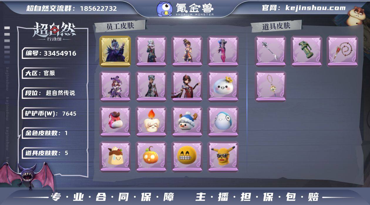金皮1;紫皮6;道具皮5;皮肤:零-渡鸦公爵,爱丽丝-耀眼的你,爱德华-梵卓之礼,艾伦-黎明猎手,薇薇安-仙锋小姐,兰-千夜星谕,阿念-庆宴绮愿;道具:长鞭-缚誓之锁,铲子-撒拉弗的祷告,急救包-蔷薇物语,闪光弹-金戈玄铜,摸金符-紫霄;饰品:头饰-惊魂南瓜头套,头饰-萨卡班甲鱼头套,头饰-面具马头套,头饰-雪墩墩头套,头饰-蒜了八,头饰-滑稽头套,头饰-哈士奇头套,头饰-烛光纪念,头饰-鱼头怪头套,头饰-太空鲨头套,头饰-卑微头套,头饰-嘻嘻头套,头饰-呆滞头套,头饰-芝麻糊汤圆,头饰-烈焰红唇头套,头饰-樱桃奶油布丁,头饰-马上有钱,头饰-像素朋克墨镜,头饰-后室幸存者头套,挂饰-糖果守卫,挂饰-孤独对望,挂饰-晚安小熊,背饰-牛啤背包,背饰-侧耳倾听,背饰-班卓琴;动作:动作-心跳摇,动作-舞台中心,动作-金城舞,动作-奶龙舞,动作-不孬摇,动作-新年摇,动作-蝴蝶步,动作-要糖,动作-滑步舞,动作-拜年,动作-抬手,动作-举牌;工牌背景:工牌背景-心同野鹤,工牌背景-粉嫩小海狸,工牌背景-永夜巡礼,工牌背景-复活的肖像,工牌背景-春和景明;工牌动作:工牌动作-春色盈怀;员工:临云,员工-兰,员工-小黄,员工-莉莉,员工-巫铃儿,员工-薇薇安,员工-艾伦,员工-零,员工-小满,员工-爱德华,员工-爱丽丝,...
